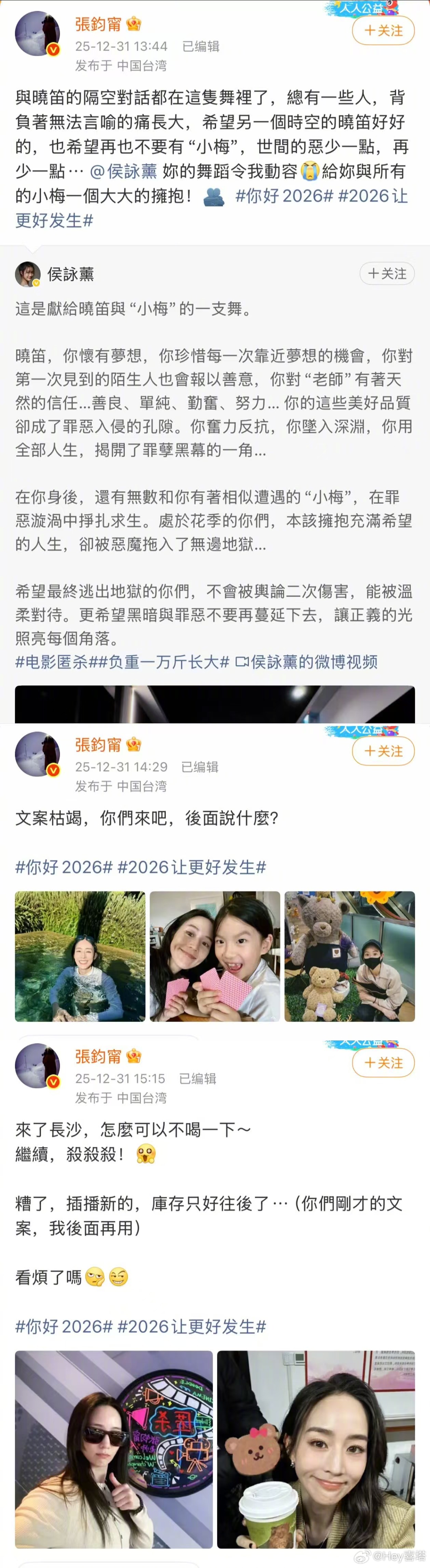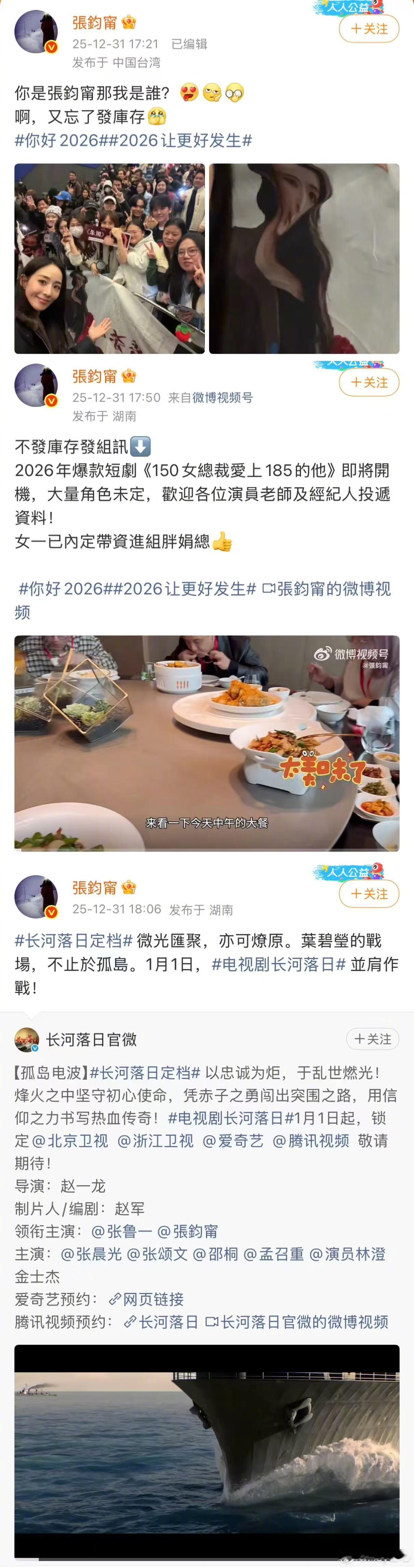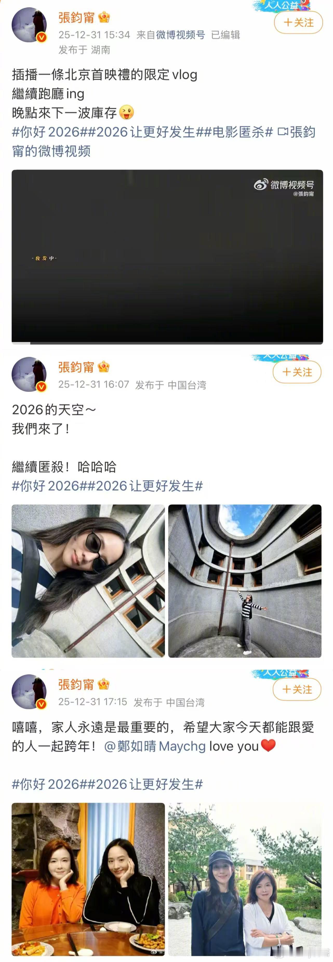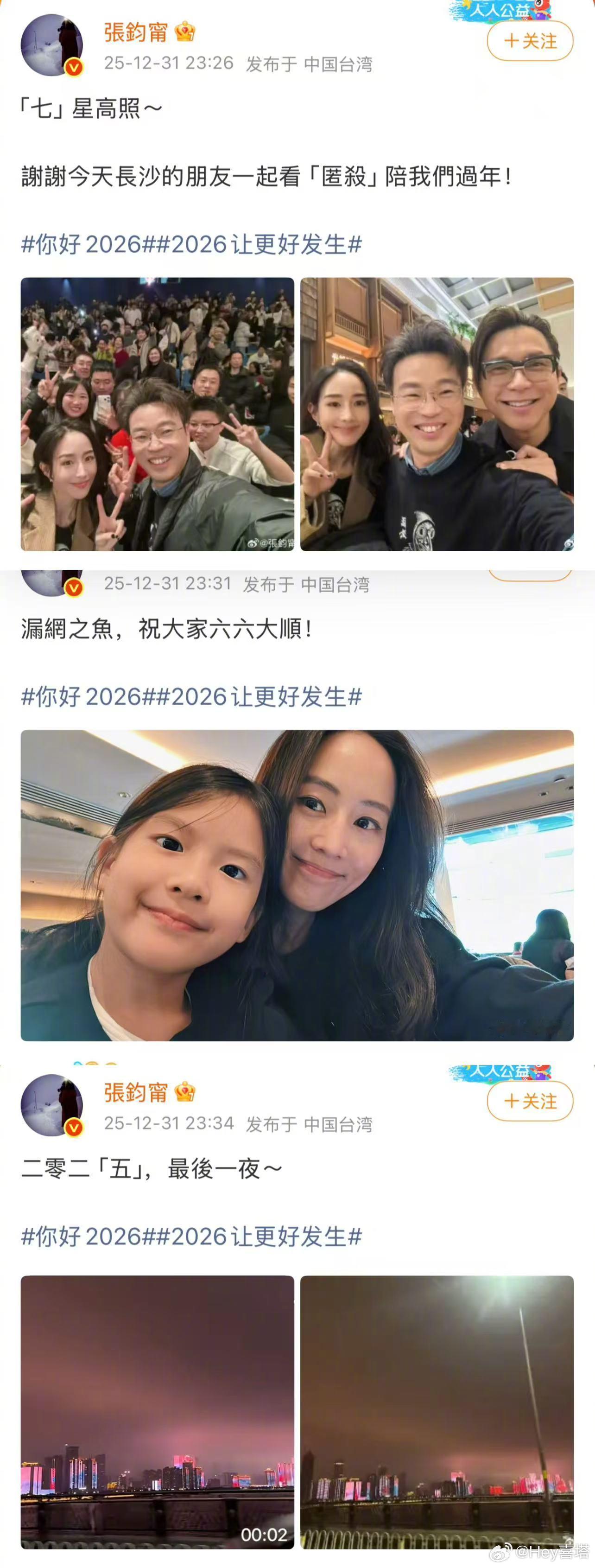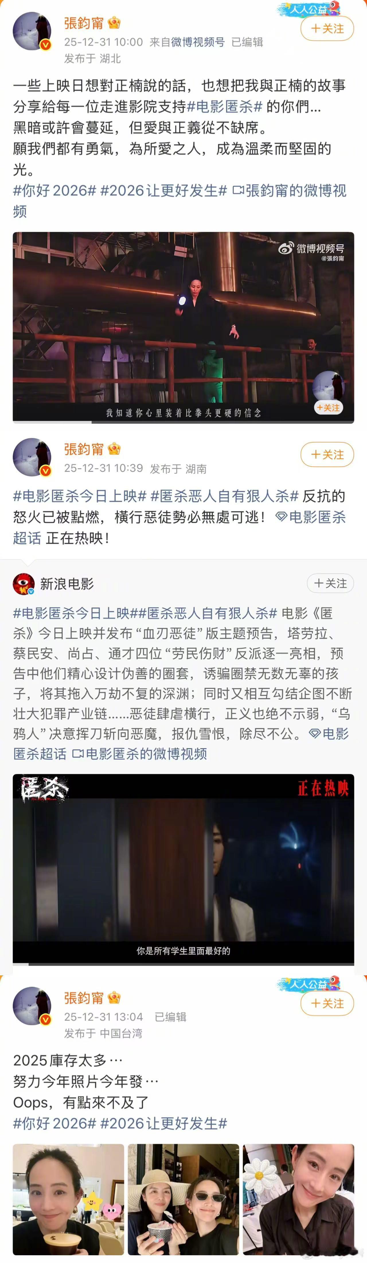 张钧甯告别2025发了25条微博 谁懂啊!张钧甯的跨年仪式感直接拉满!2025最后一天连发25条库存微博,卡点倒计时把仪式感焊死,今年照片今年发的执念也太戳人,跨进2026立马更第26条完美收尾,每条都是藏不住的用心。更绝的是开年双惊喜,电影《匿杀》昨日刚上映,谍战大剧《长河落日》今日同步开播,银幕上的高能对决,剧集里的质感演绎,双向开花的张钧甯,粉丝这波真的赢麻了!跨年热梗制造机