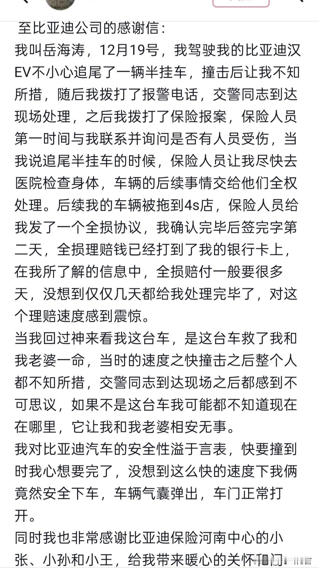 比亚迪汉EV追尾半挂,过硬的车身保护了车内的成员。比亚迪保险的保险人员也很温暖,效率也很快,车主以为像这种全损的车,全损的款项很慢,没想到比亚迪保险这么快就赔付了。比亚迪汉EV车主还特意在抖音上写了一封感谢信,随即这个汉EV车主又用全损款买了一辆比亚迪汉L。安全才是最大的豪华,比亚迪保险效率很快。