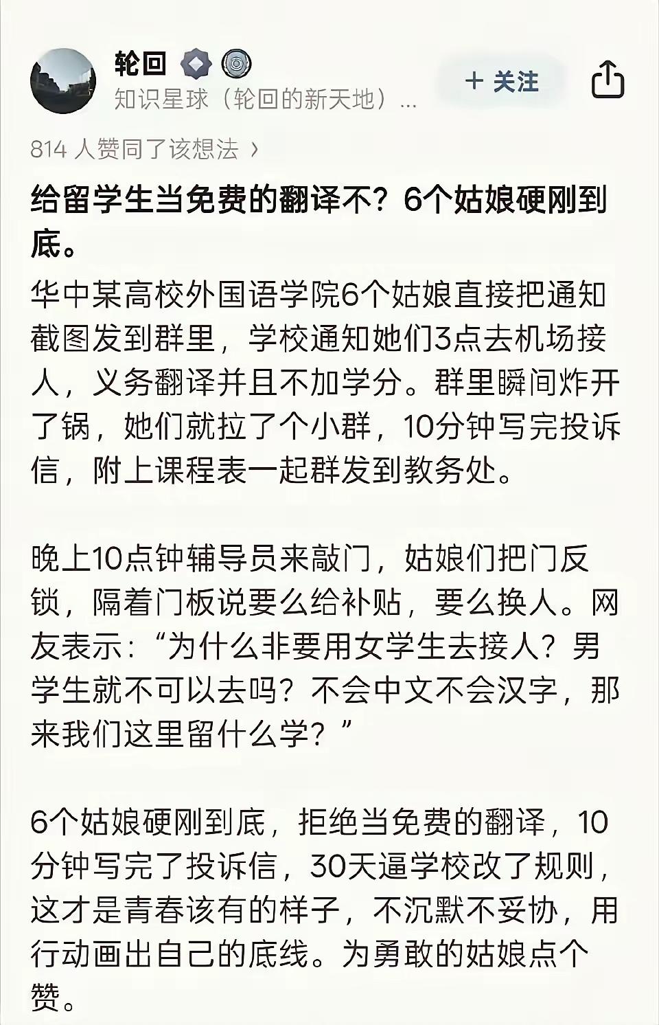 好家伙, 现在年轻人硬是“刚”得没边儿啦! 学校让6个女生去接待中文磕磕绊绊的 外国留学生,这几位女生直接“达咩”,不仅不去,还化身“投诉信狂魔”,愣是把学校规则给“改头换面”了! 这操作,要是搁80、90后身上,说不定就先“忍气吞声”把事儿办了。 00后这波“硬刚”,哪是叛逆啊,分明是权益和平等意识提前“觉醒”啦! 话说回来,来华留学整个中文门槛,我觉得挺在理,不然咋交流,难道靠“心灵感应”吗? 你站这些女生不?觉得该设中文门槛不?