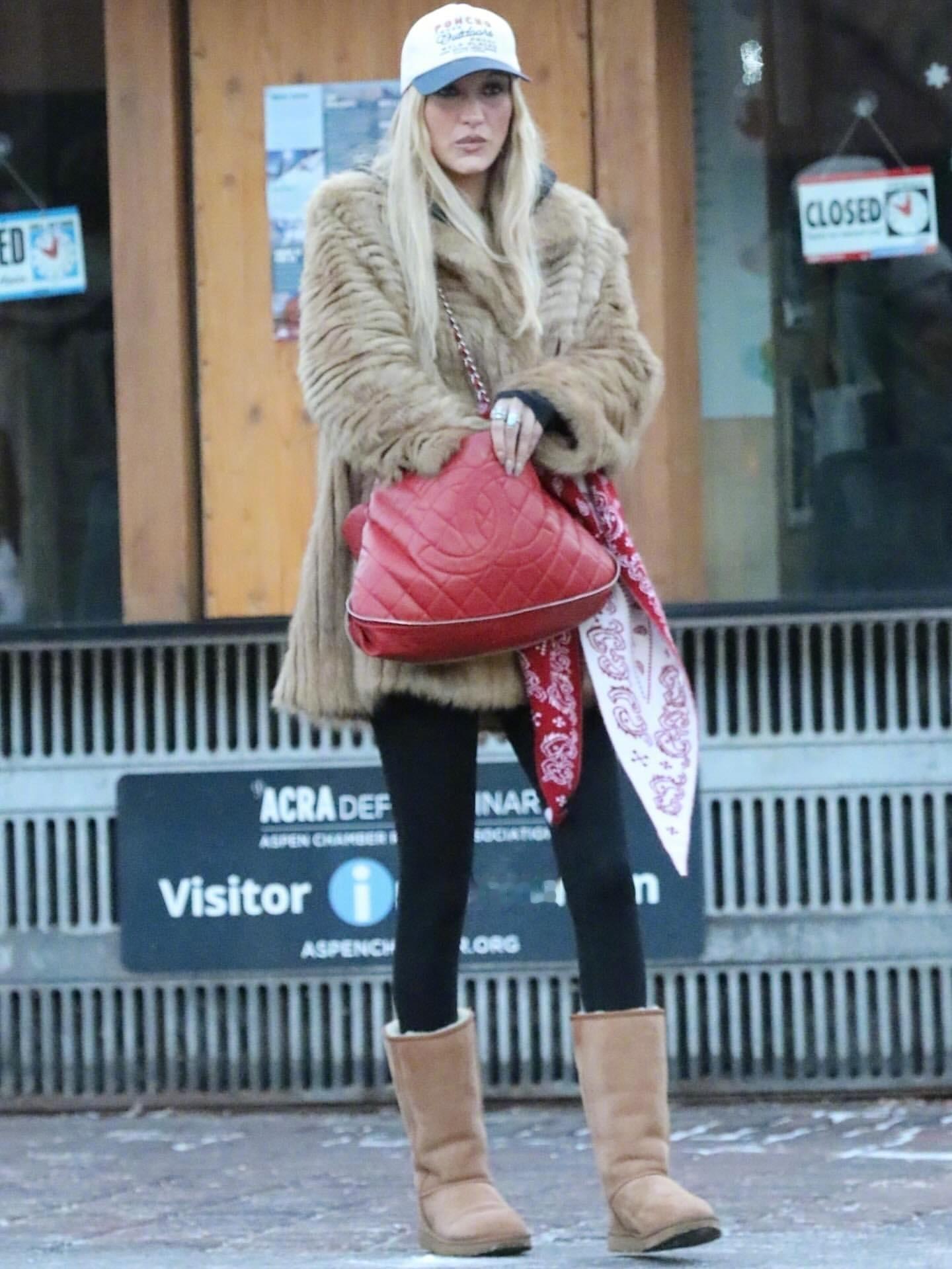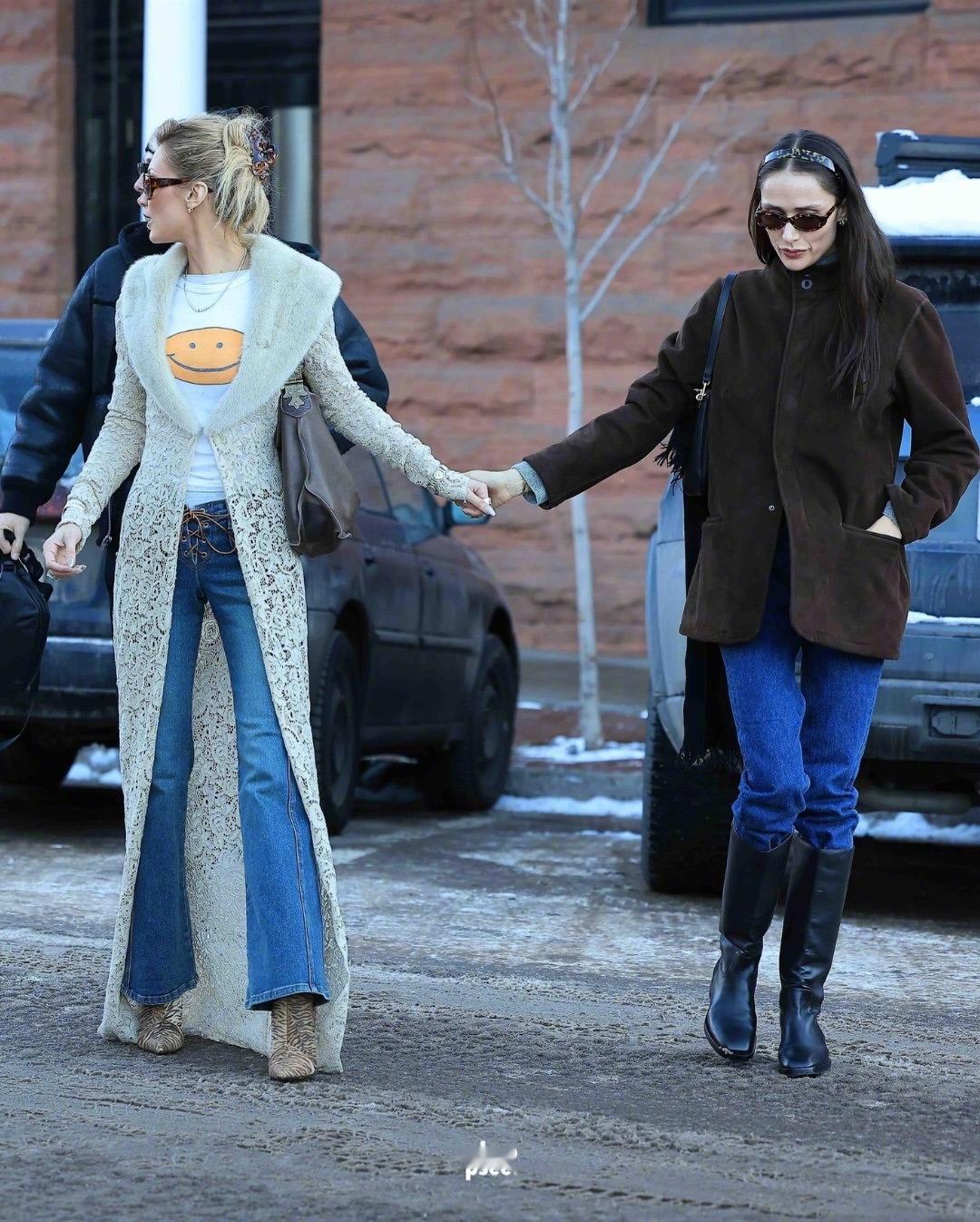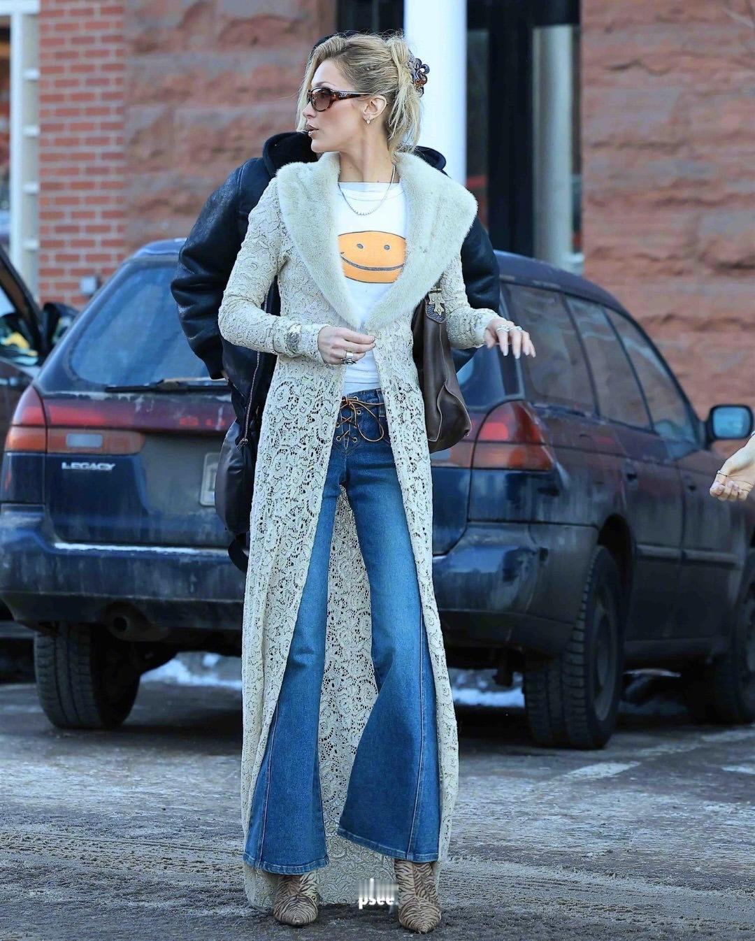 和朋友们一起现身美国阿斯彭滑雪度假的Bella Hadid 。两套复古造型现身。look1,身穿的是Valentino 褶皱羊毛大衣,脚穿UGG ,肩背Chanel 2011年的菱格纹鱼子酱包,佩戴Poncho Texas棒球帽。look2, 回归2000年代初期的风格。内穿印有巨大笑脸的短款babyT恤,里面还叠穿了一件T恤,下穿了一条2000年代的前襟牛仔裤,外穿蕾丝毛领披风,打造出十足的千禧年时尚感。很怀旧的两身造型。米拉服饰解析