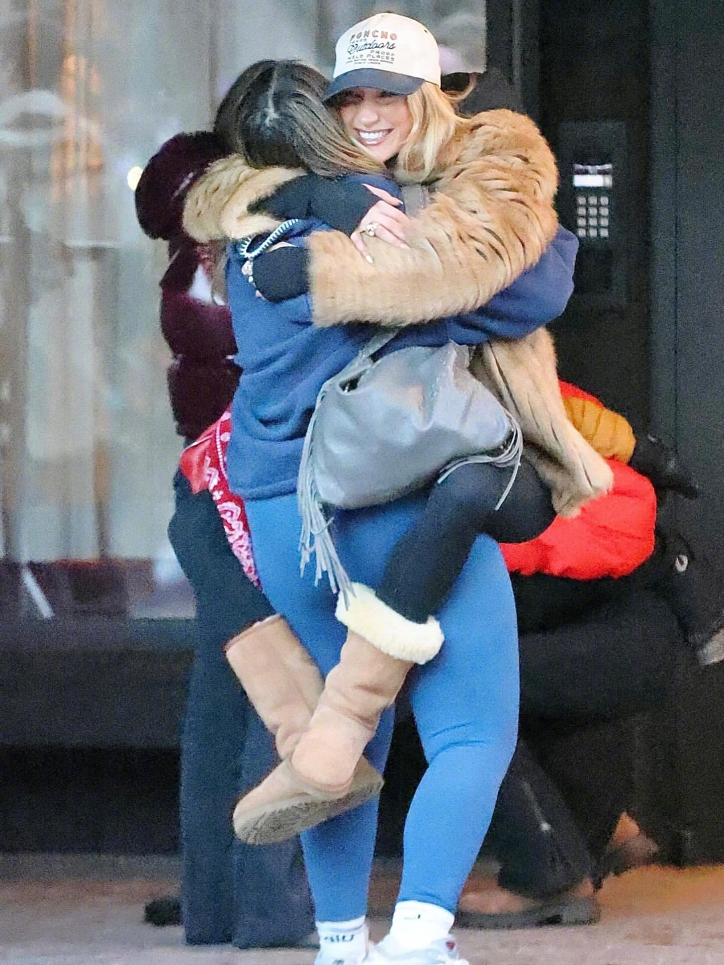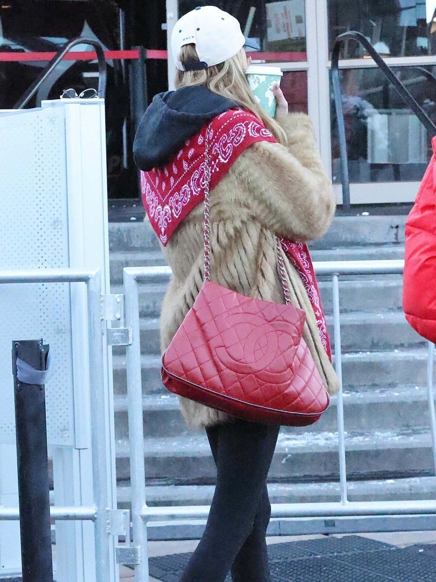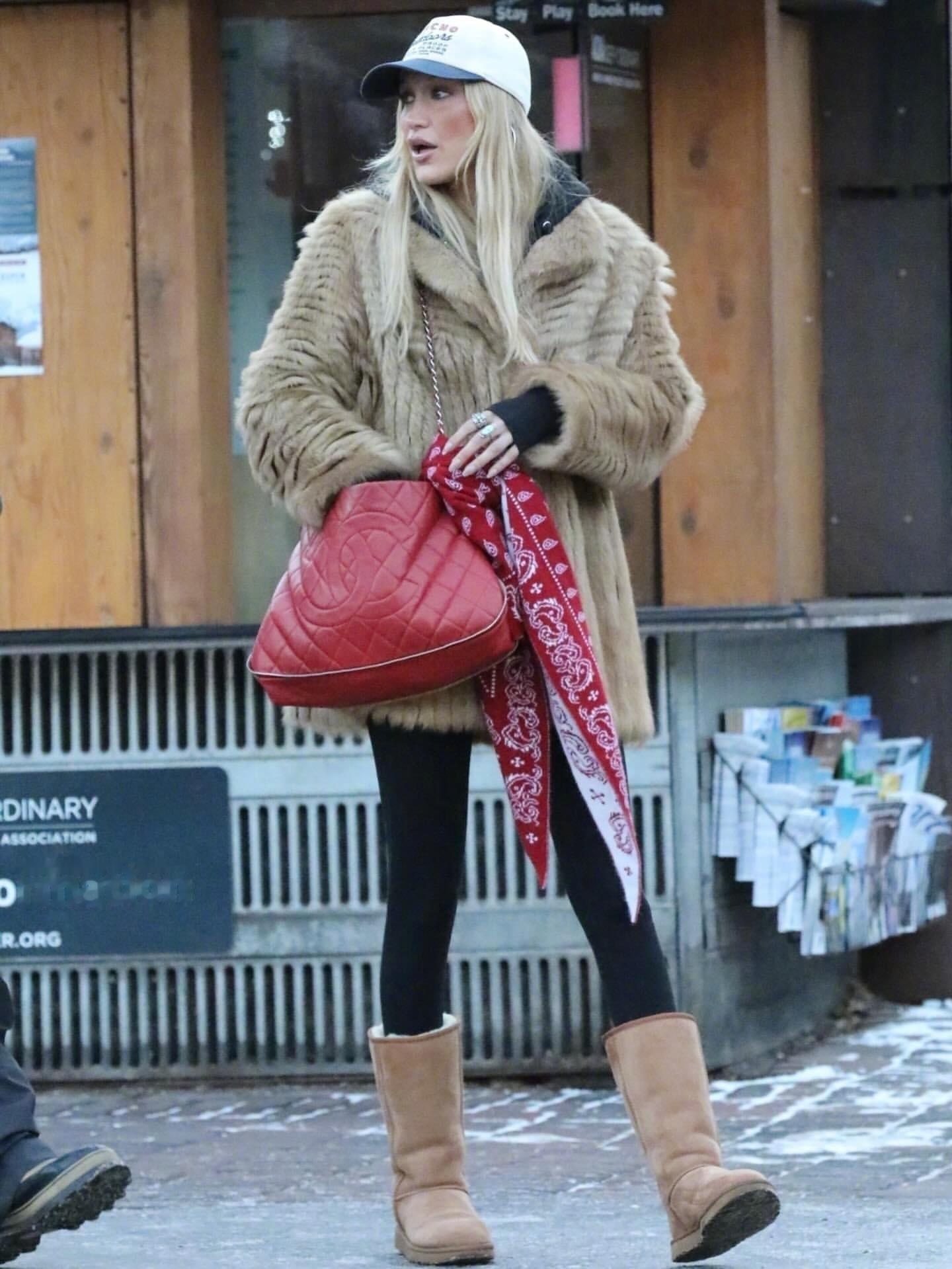 和朋友们一起现身美国阿斯彭滑雪度假的Bella Hadid 。两套复古造型现身。look1,身穿的是Valentino 褶皱羊毛大衣,脚穿UGG ,肩背Chanel 2011年的菱格纹鱼子酱包,佩戴Poncho Texas棒球帽。look2, 回归2000年代初期的风格。内穿印有巨大笑脸的短款babyT恤,里面还叠穿了一件T恤,下穿了一条2000年代的前襟牛仔裤,外穿蕾丝毛领披风,打造出十足的千禧年时尚感。很怀旧的两身造型。米拉服饰解析