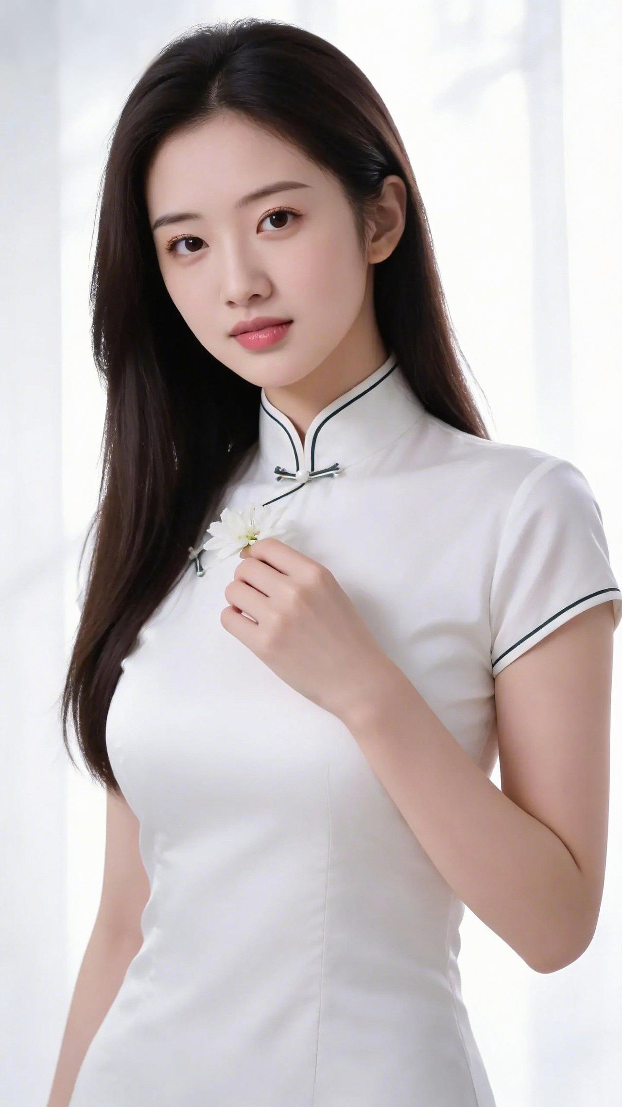 白旗袍裹素雅温 柔光轻覆周身,她身上的白旗袍似裁了云的柔——青边缀着盘扣的雅,指尖拈着的白花沾着浅香,衬得素色愈发明润。 长发垂落肩侧,唇色轻润如粉,立在清浅光影里,像把中式温婉织进衣料褶皱。 恰似庭间初绽的白棠,无张扬艳色,只有妥帖的雅——传统的柔裹入每寸衣料,抬眼的静,都浸着这抹素白的温。 白旗袍中式穿搭 素色温婉感