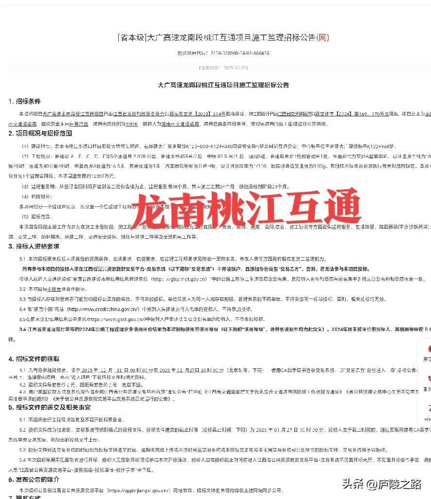 赣州龙南市2026年将新增一个高速公路出入口。 大广高速公路桃江互通施工招标公告和施工监理招标公告发布了。 建设地点:龙南市桃江乡洒口村白石岭大桥桥头附近,在新建大广高速复线K122+000-K124+340间设置变异A型单喇叭互通立交,中心桩号位于新建大广复线桩号K122+968处。 (2)工程概况:新建设 A、B、C、D、E等5个匝道共 2.098 公里,新建大桥458米/2座、中桥 83.5 米/1 座、涵洞3道,新建收费站1处和管理所1处。互通形式为变异A型单喇叭,设计速度主线为100公里/小时、匝道为40公里/小时,路基宽度A匝道为16.5米、其余匝道为9米,汽车荷载等级为公路-I级,设计洪水频率为1/100,地震动峰值加速度为0.05g。其他技术标准及要求执行有关规范的规定。本项目共划分为1个监理合同段。本项目建安费约12207万元。