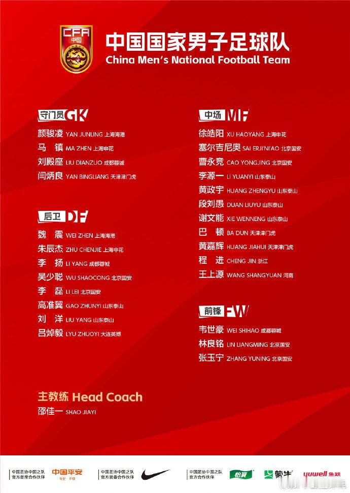 邵佳一执教国足首期集训大名单 于汉超出任国足训练员为做好2027年亚洲杯备战工作,经国家队教练组研究、中国足球协会批准,中国国家男子足球队定于2026年1月4日至27日先后赴广东省肇庆市、阿联酋迪拜组织集训。主教练:邵佳一教练组成员:莱纳·毛雷尔、杨智、周挺、埃米利奥·费尔南德斯、特尔莫·诺瓦尔训练员:刘健、于汉超运动员(26名)上海海港足球俱乐部:颜骏凌、魏震上海申花足球俱乐部:朱辰杰、徐皓阳、马镇成都蓉城足球俱乐部:刘殿座、韦世豪、李扬北京国安足球俱乐部:李磊、张玉宁、塞尔吉尼奥、林良铭、曹永竞、吴少聪山东泰山足球俱乐部:李源一、高准翼、刘洋、黄政宇、段刘愚、谢文能天津津门虎足球俱乐部:巴顿、闫炳良、黄嘉辉浙江职业足球俱乐部:程进河南足球俱乐部:王上源大连英博足球俱乐部:吕焯毅国足2026年第一期集训名单