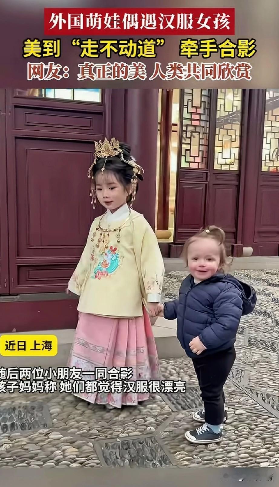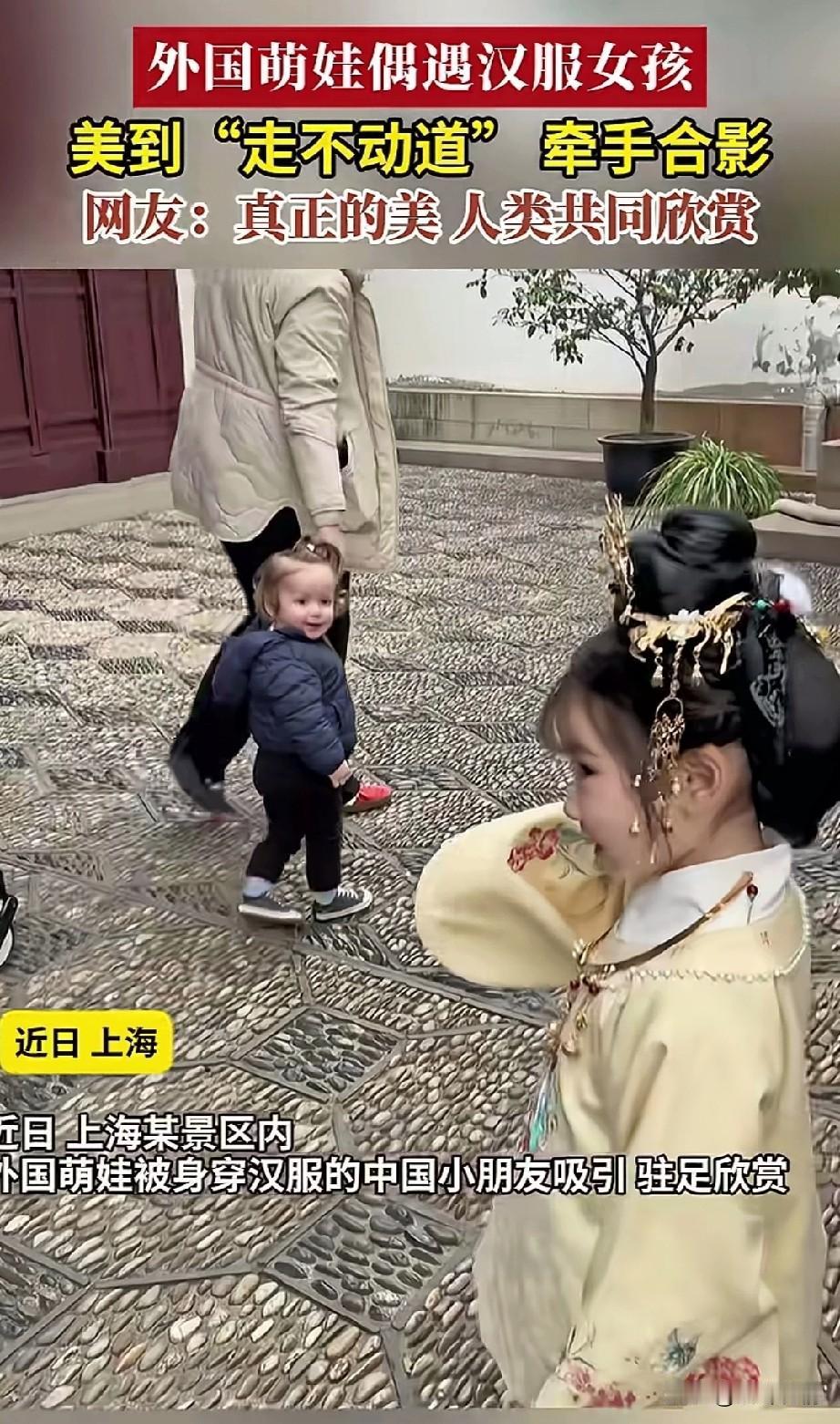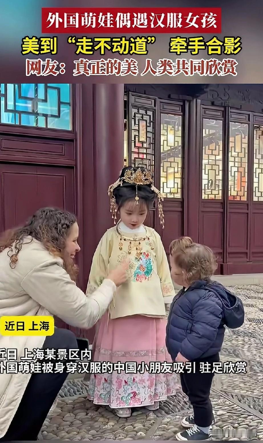 近日上海某景区内, 一外国女子牵着自己金发的小宝宝在逛景区,小宝宝看到一个穿着汉服的小姐姐, 不时的扭头去看, 他可能是觉得实在是太美了, 直接让他走不动道了, 他的妈妈这才意识到小宝宝很喜欢这个姐姐,于是就走上前热情的和汉服小姑娘打招呼,小姑娘也不怕生人, 站在那里让小宝宝看个够, 老外女子摇晃着汉服小姑娘胸前的铃铛,最后两个小朋友开心的合了影, 老外妈妈表示她和孩子都觉得汉服非常的漂亮,所以说汉服才是顶流, 这一点没错,美的事物都是共通的, 即便文化不同, 但是对于美的追求都是一致, 网友也表示真正的人类共同欣赏, 说的是一点也没有错, 连老外小宝宝都喜欢的美, 那就是真的没了, 你还别说穿汉服的小姑娘, 以后绝对是个美人, 不知道以后长大了会便宜哪家小伙子? 大家对于上海景区外国萌娃遇到汉服小姐姐要合影这事怎么看? 上海 汉服女小童 外国美女带娃 萌娃上海行 洋人带孩子 平江路汉服美女 萌娃老外 儿童汉服跟拍