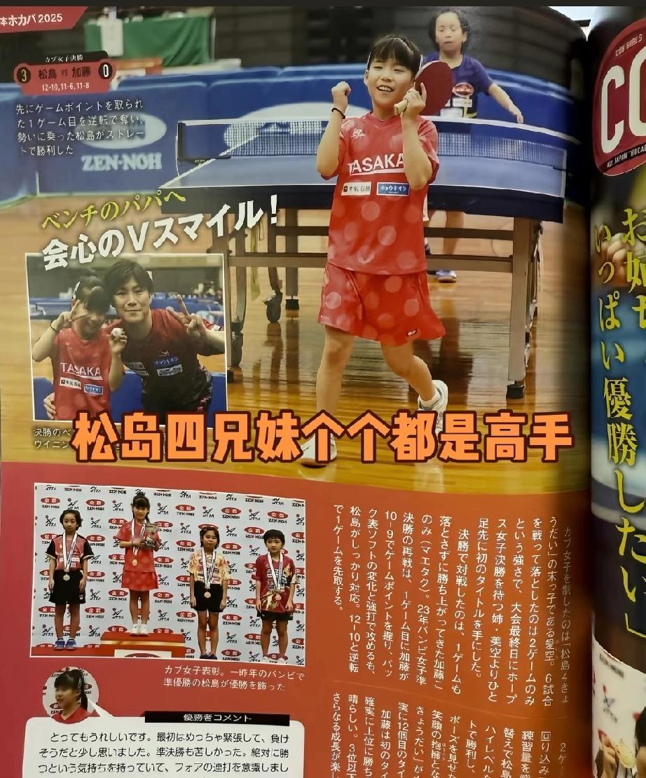 提醒国乒女队,千万不要忽视,松岛辉空家的两个女孩。 第一张是,松岛辉空一大家子在庆祝元旦,看上去一家六口都很开心。 第二张是三年前,父、母亲都很年轻,4个小孩都长得很像。 都说日本生育率很低,但感觉上日乒选手,很多都有几个兄弟姐妹。 巧合的是,松岛辉空家的四个孩子都是左手将: 1、大公子:松岛辉空,2007年出生,18岁;最近世界排名第8。 2、二公子:松岛翔空,2009年出生,16岁;虽未获大赛冠军,在同年龄日乒中,排名前10。 3、大女儿:松岛美空,2013年出生,12岁;近几年战绩彪炳,日本已经用最强女王来形容她,主要成绩有: ①、2025年,日本全农杯乒乓球锦标赛,在U-12岁(5-6年级)组中保持全胜、仅失1局实现5连冠,成为继瓷娃娃--福原爱之后,第2位完成这一壮举的球员。 ②、2025年,wtt香港青少年挑战赛:越级5岁,挑战U-17岁年龄组,在决赛中,以3-2力克中国台北球员吕璃恩,勇夺生涯首座U-17 女单冠军奖杯。 4、小女儿:松岛爱空,2015年出生,10岁。2025年全农杯小学生组3-4年级,全日本冠军。 球迷们都知道,松岛辉空近一年,成绩及能力进步很大,世界排名从60+窜至第8,目前,已成为国乒的主要对手。 同样,要重视松岛辉空的两个妹妹,看她们的成长速度,也许下一个奥运周期,也会成为张本美和,甚至超过她,对国乒女将带来的威胁。