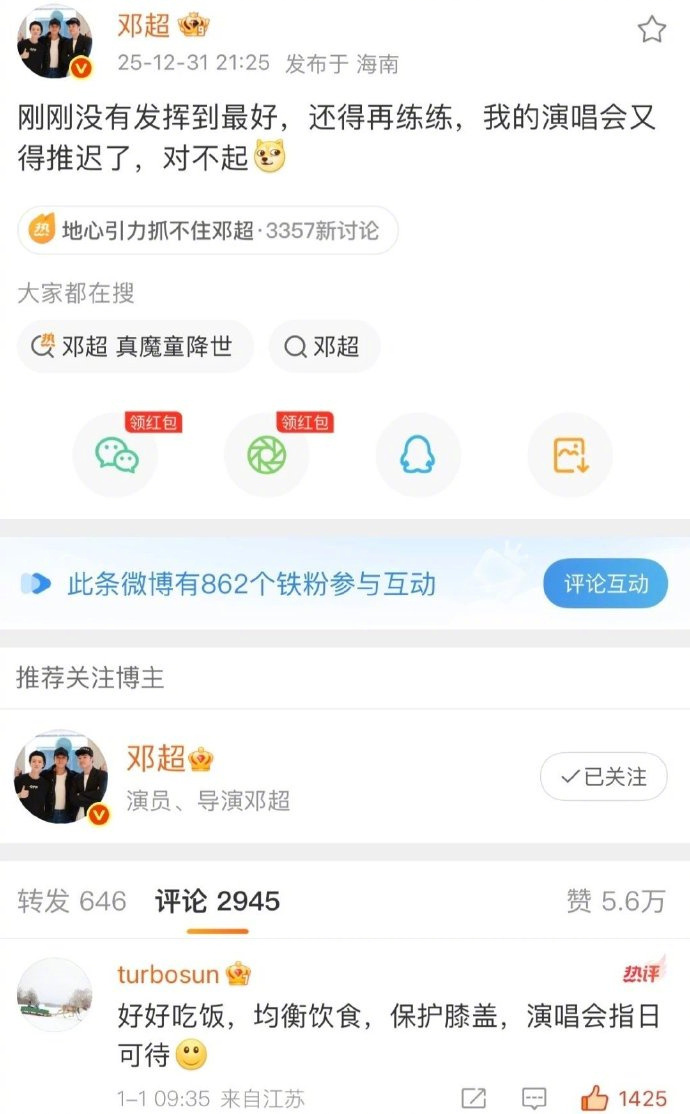 12月31日,在2025年跨年夜上,邓超与孙俪上演隔空互动,引发热议。邓超在湖南卫视跨年晚会全开麦唱跳后发微博,称因膝盖旧伤复发导致“未发挥到最好”孙俪提醒其:好好吃饭,均衡饮食,保护膝盖,演唱会指日可待。邓超 孙俪 (热度新闻)
