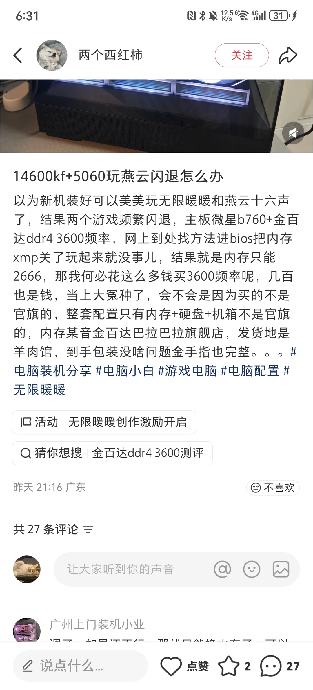 刷单过两个帖子,都是微星+金百达组合,一个闪退不能开xmp,一个是蓝屏,,。。再强调一遍,实践中,微星+金百达组合兼容就是不好,不知道的自己百度,而且,而且,我一直不推荐用c36的内存,你以为只是时序高嘛?你有没有想过,c36的内存质量跟兼容可能也一般呢???你可以金百达+技嘉+华硕,也可以微星+雷克沙或者+百维 宏碁,就是别用微星+金百达组合,,一些没修过几台电脑到处给人出配置单做科普的懂哥有几个真懂得?修过几台电脑,动不动就喜欢抬杠,实践就是,有些组合真的事多。。为嘛不推荐2 3线主板?一线主板你以为只是贵?一线主板跟那些大厂内存,最大的优点就是兼容,而不是所谓的挑颗粒能超,,你以为你买的三流内存运气好能超?有没有可能内存颗粒都是从旧内存坏内存拆下来的?一些二三流内存为嘛兼容差质量差???想想,想想。