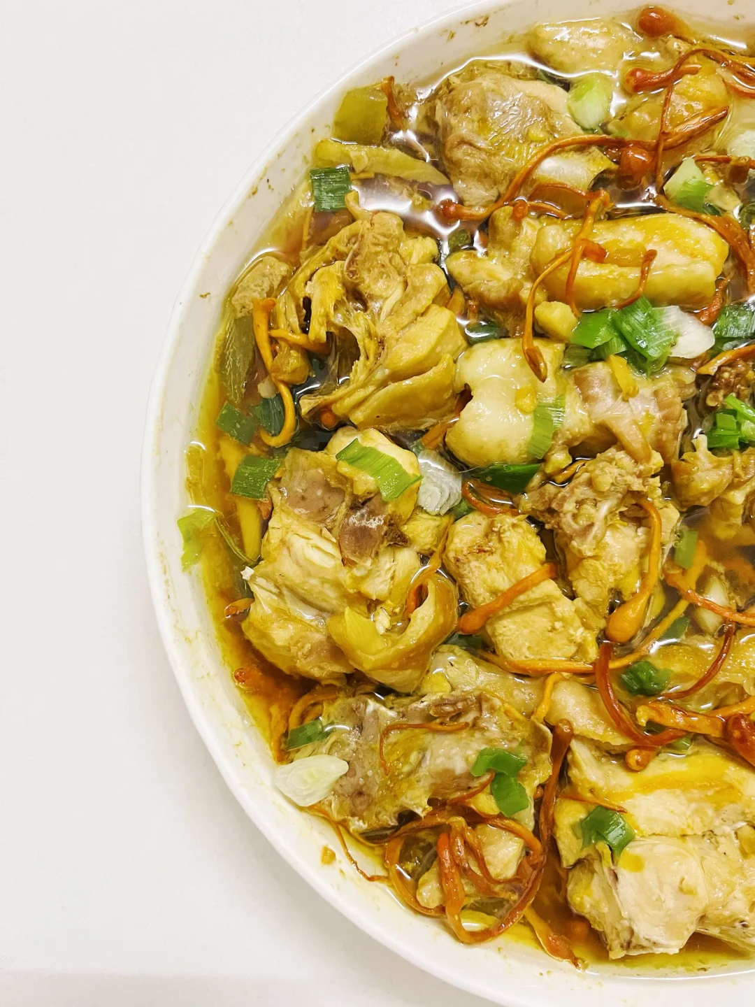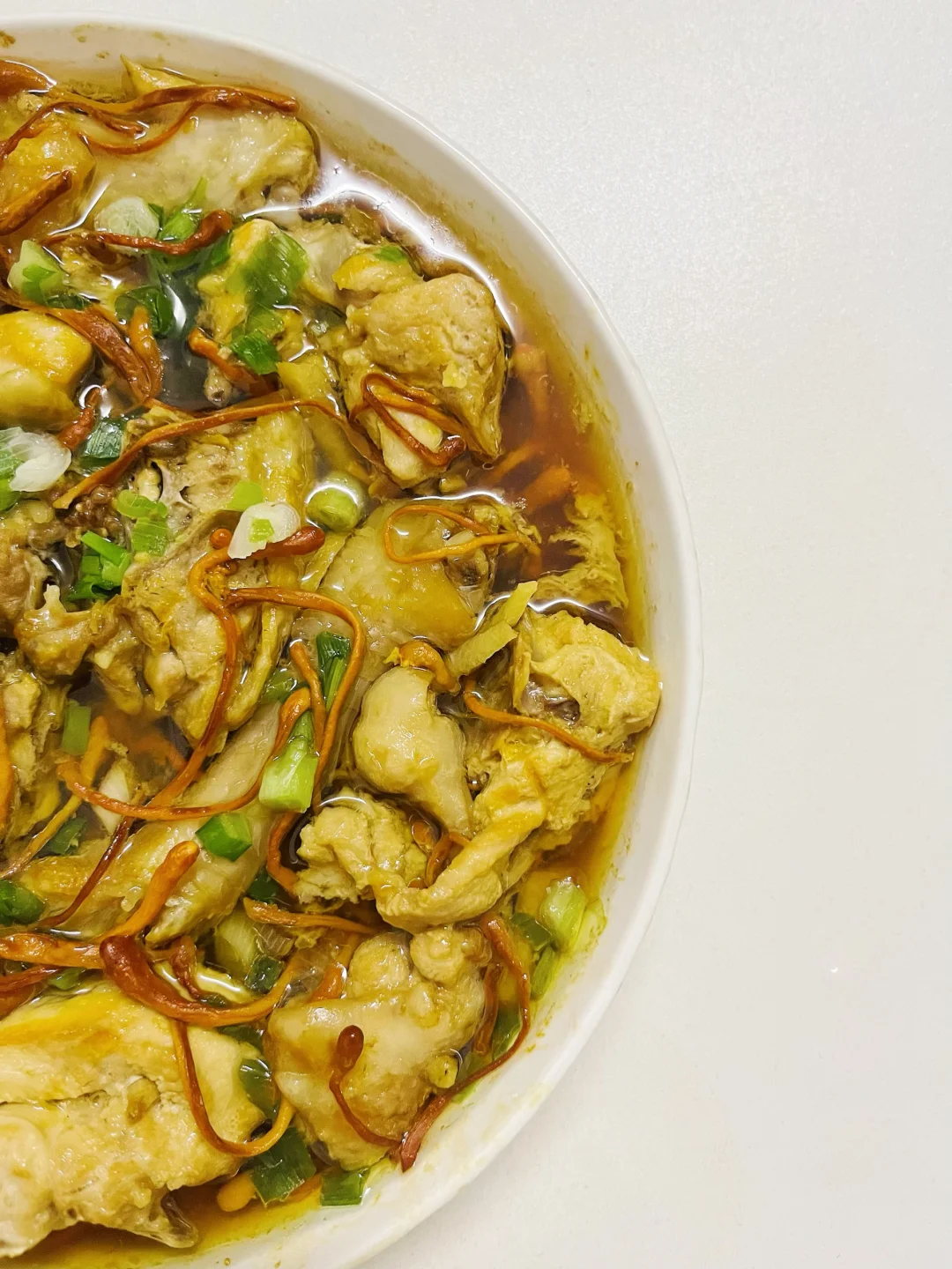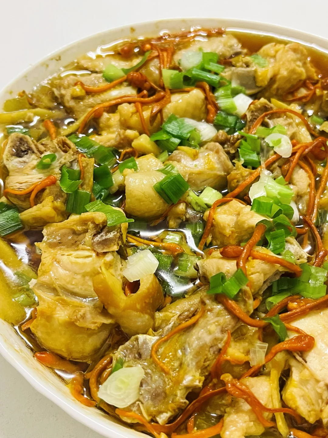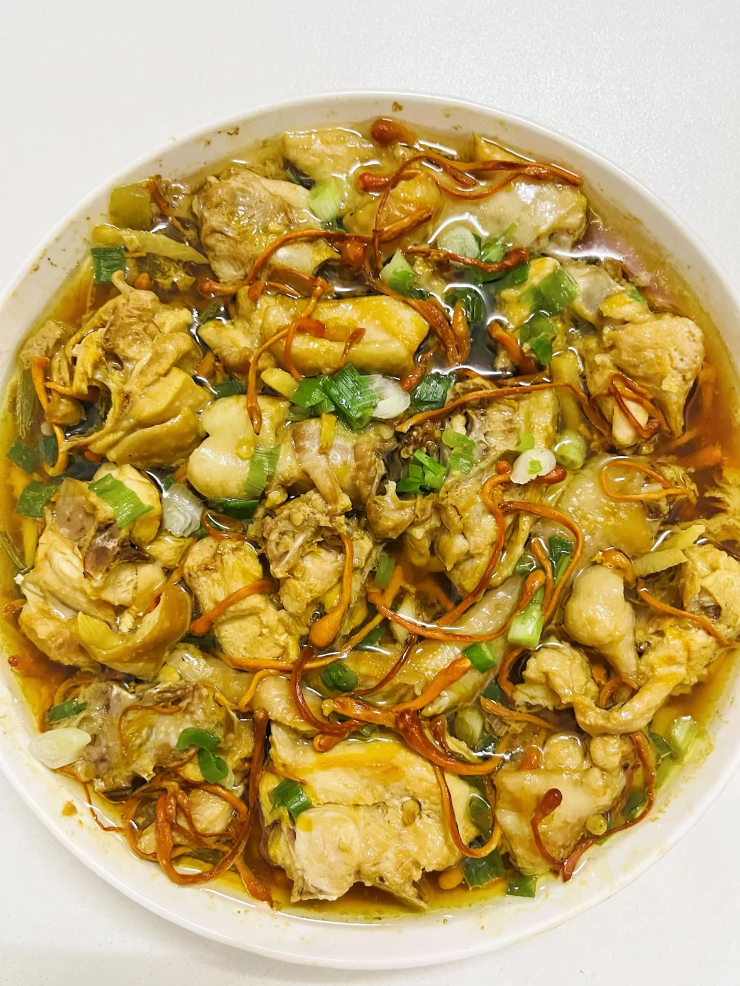 鸡肉嫩滑多汁,冬瓜吸饱了鲜美汤汁,虫草花金灿灿的看着就养生~
