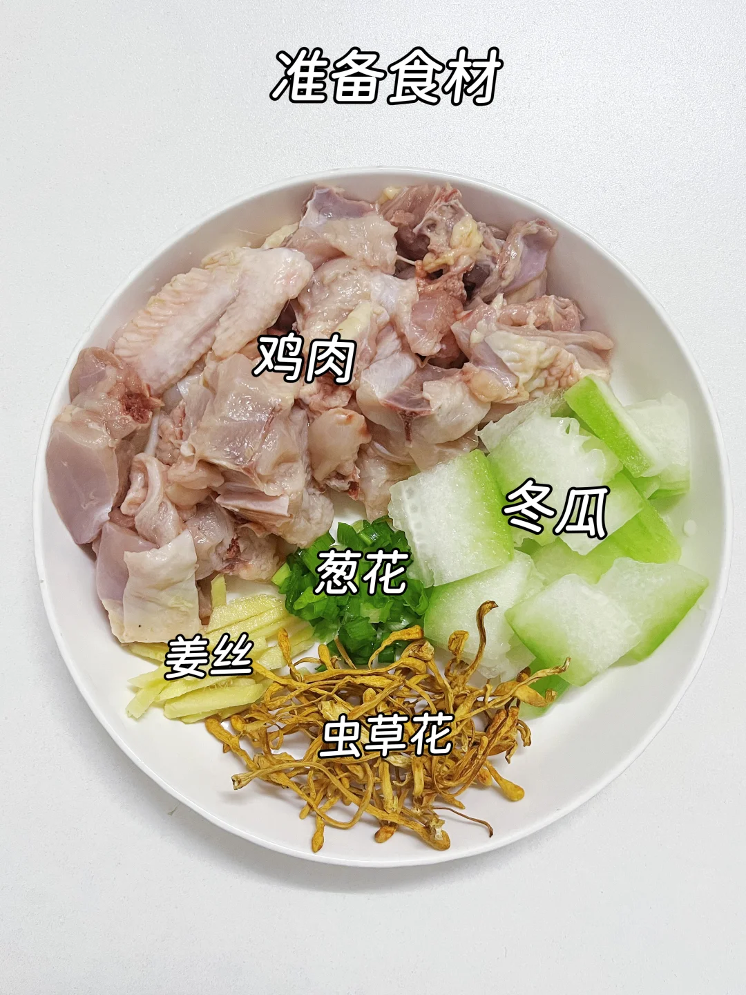 冬瓜、鸡肉、虫草花、姜丝、葱花