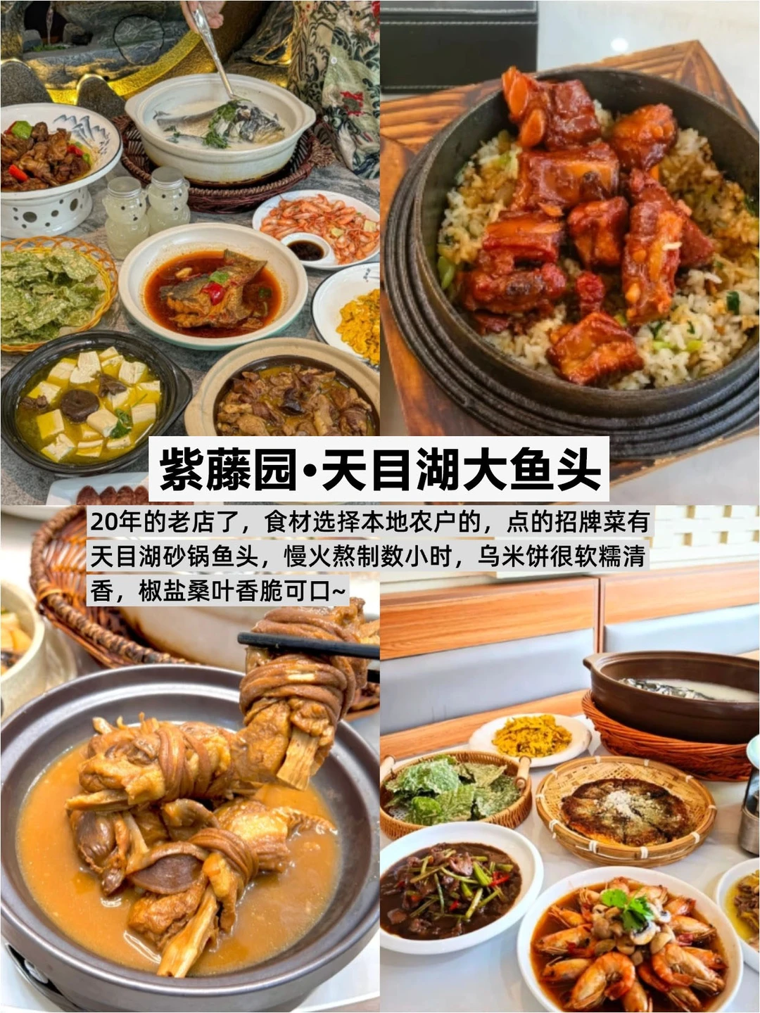 紫藤园·天目湖大鱼头:20年老店!砂锅鱼头慢火熬制,乌米饼软糯,椒盐桑叶香脆