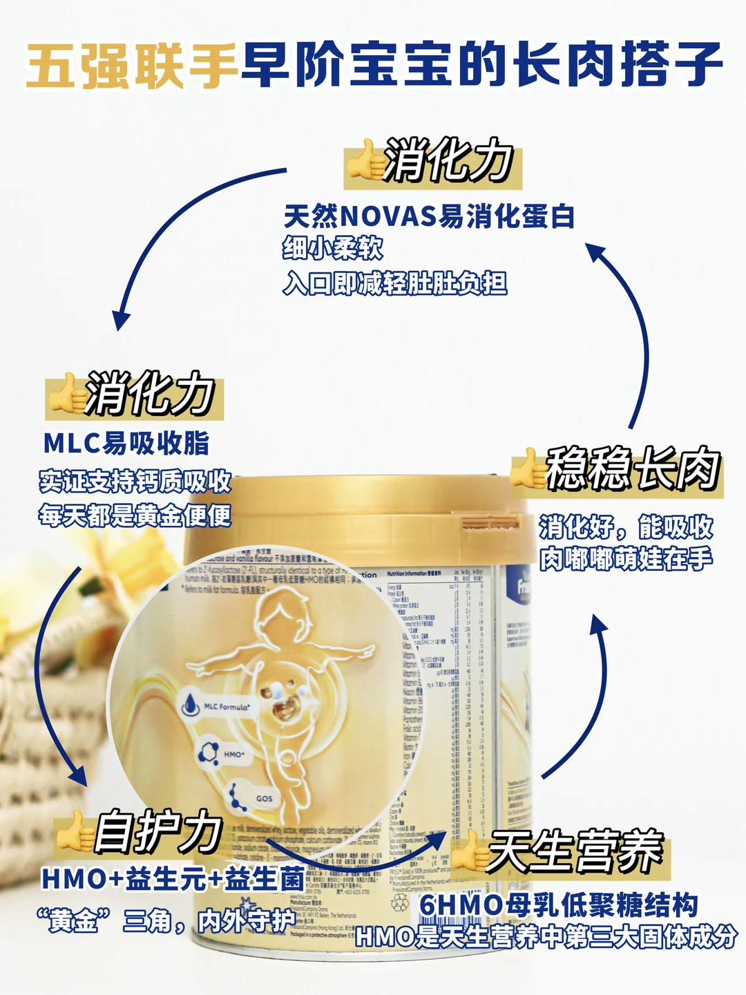 还有6种HMO结构,HMO作为源乳中的老大哥,搭配超百种GOS益生元结构+HN019益生菌,这仨凑一块儿,可以组成保护肚肚的黄金三角。专门负责把肚肚环境搞好,把坏菌赶跑,把营养锁住。娃身体底子好了,换季都不怎么出问题
