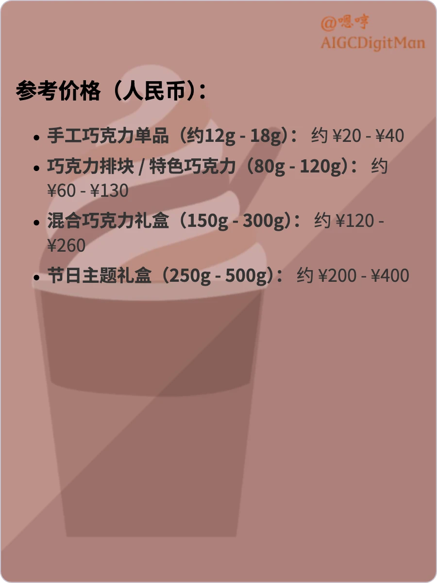 手工巧克力单品(约12g - 18g): 约 ¥20 - ¥40