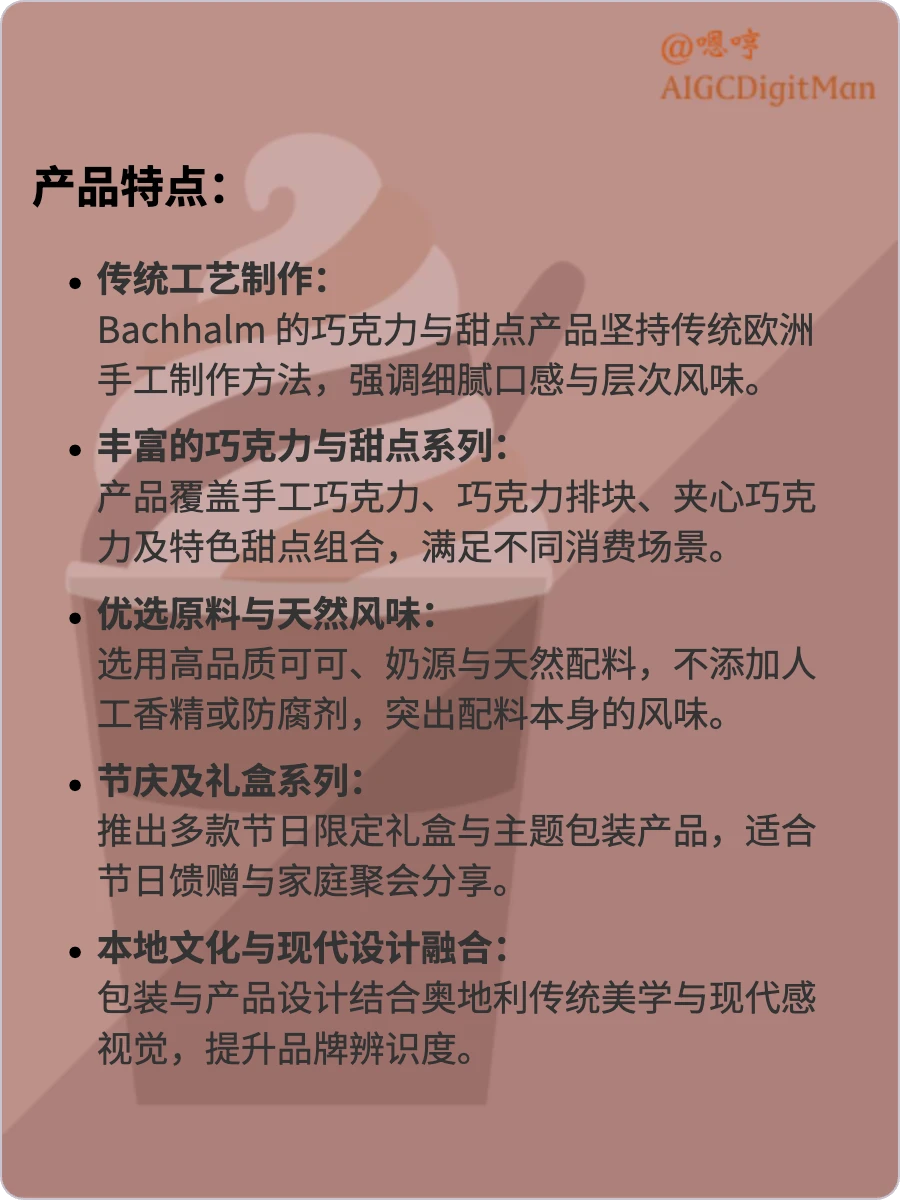 传统工艺制作: Bachhalm 的巧克力与甜点产品坚持传统欧洲手工制作方法,强调细腻口感与层次风味。