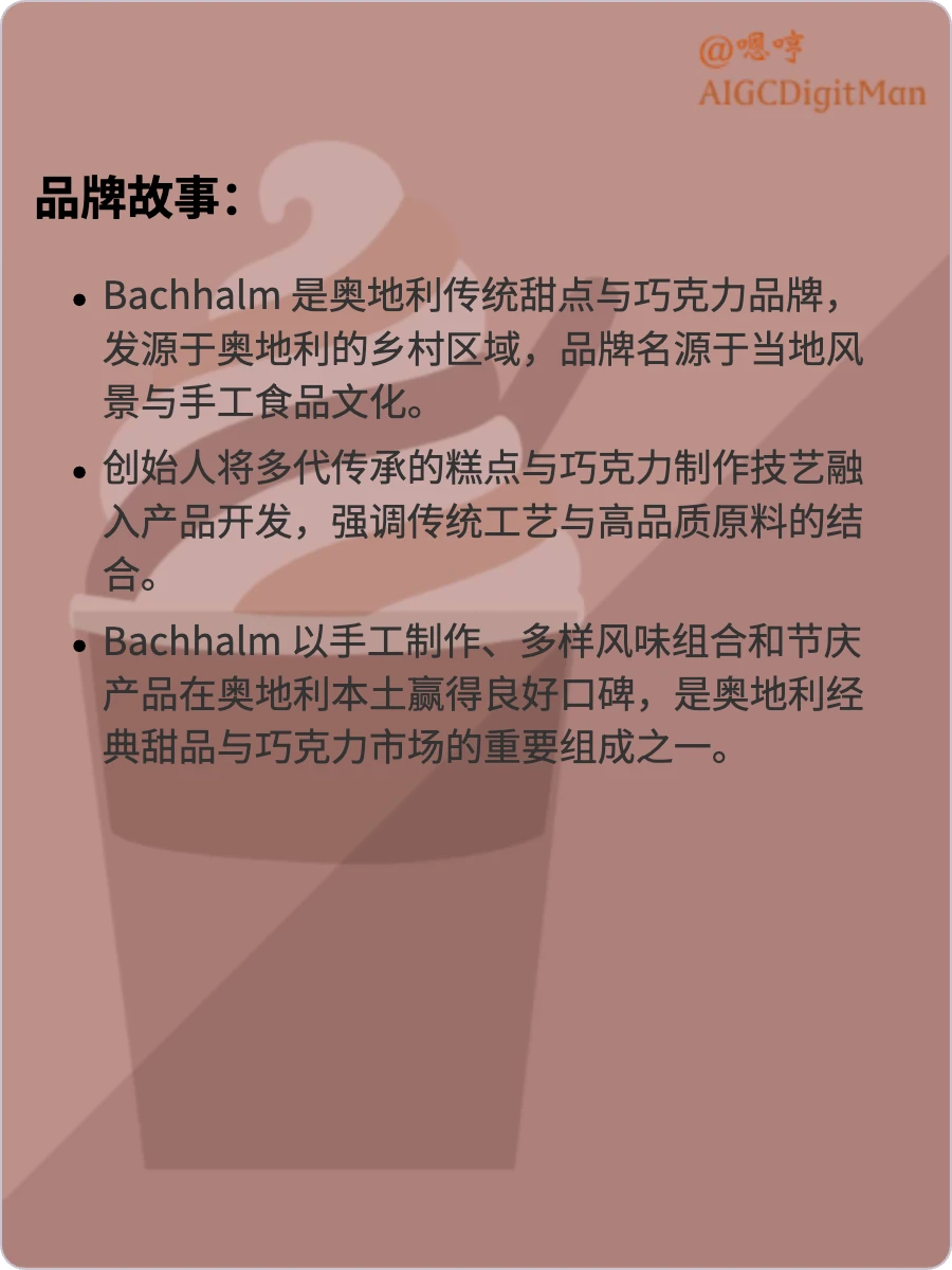 Bachhalm 是奥地利传统甜点与巧克力品牌,发源于奥地利的乡村区域,品牌名源于当地风景与手工食品文化。