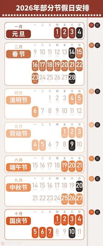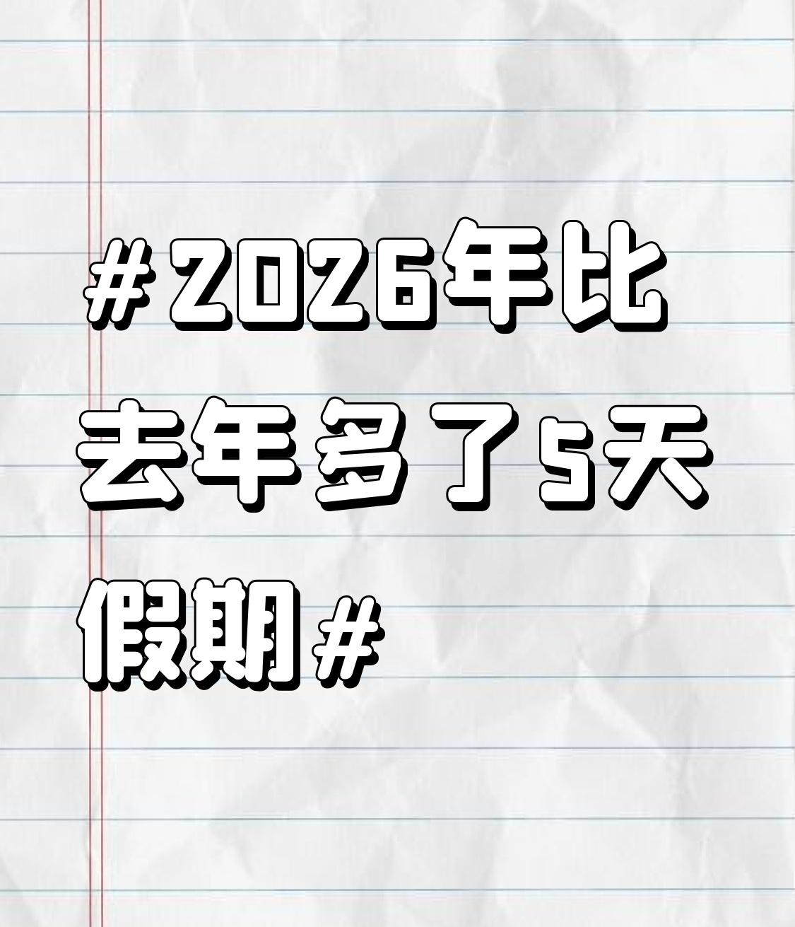 2026年比去年多了5天假期 2026年放假通知一出,简直是打工人的福音!法定节假日放假调休天数比2025年增加了5天,从28天涨到33天。 具体来看,元旦放3天,春节直接放9天,清明3天,劳动节5天,端午3天,中秋3天,国庆7天。这么多假期,能让我们有更充裕的时间去放松身心、陪伴家人。可以来一场说走就走的旅行,也能在家好好休息。这多出来的5天,感觉生活都更有盼头了,2026年值得期待!
