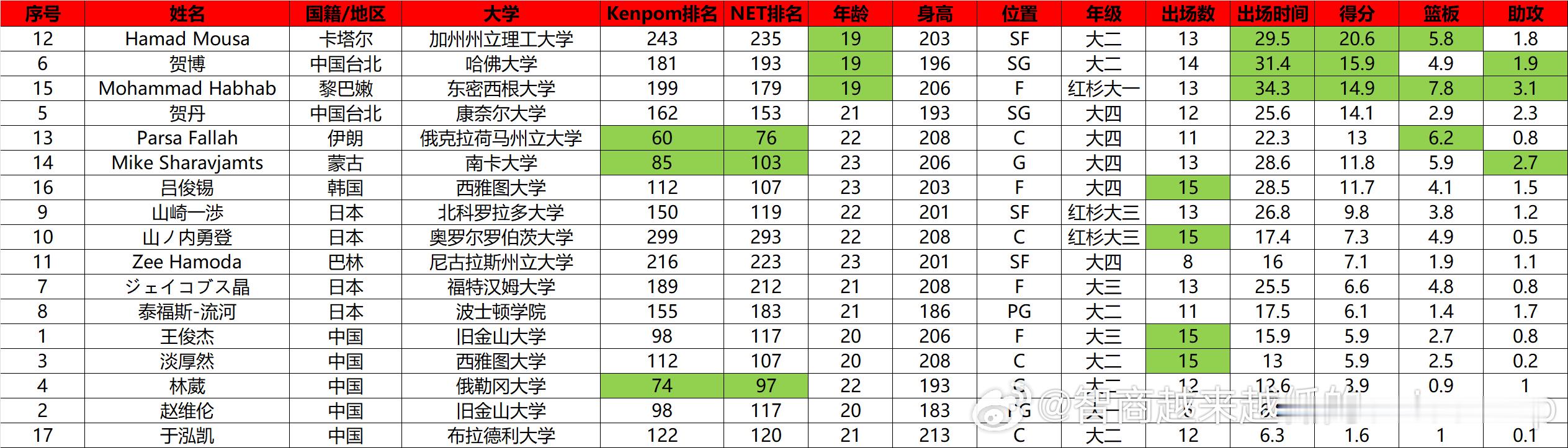 NCAA赛季中期亚洲球员表现汇总,年龄最小的三位球员包揽得分榜前三,中国球员本赛季想出现场均得分上双的球员已经无望NCAA王俊杰林葳淡厚然闯美的篮球青年 NBA