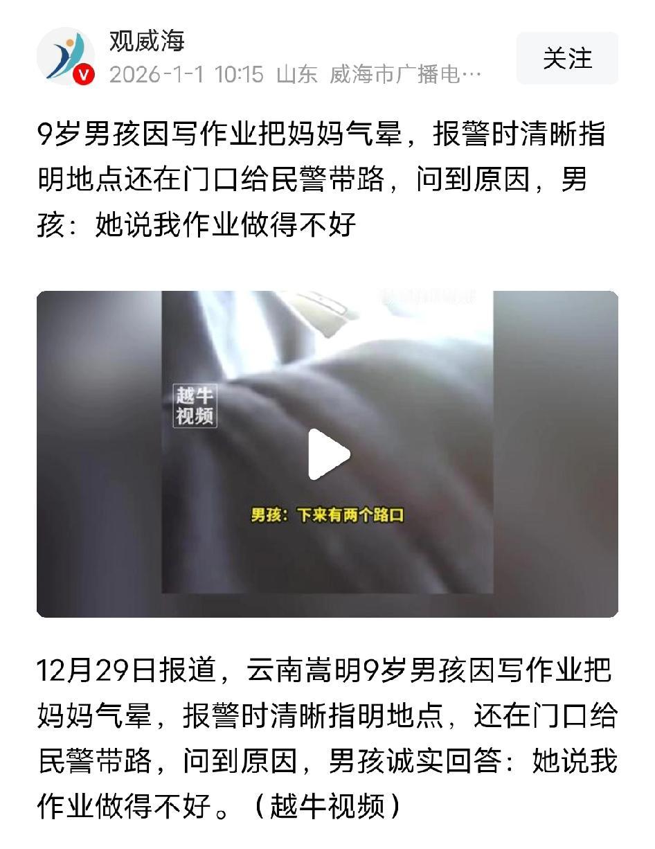 云南崇明,一名9岁男孩写作业时,结果把妈妈气晕了,令人没想到的是,男孩报了警,还能清晰指明地址,还再门口等民警的到来。 民警问男孩,妈妈被气晕的原因,男孩说:“她说我作业做的不好。 ” 此事也引起网友热议,有网友说:“他只是不会做题,但是很会做人!” 还有网友说:“ 说他聪明吧他学习学不会,说他笨吧关键时刻还能救妈妈的命。” 也有网友说:“ 很理解,我有时候会明显感觉到自己脑袋上的血管在绷,就会在心里安慰自己,真的,辅导作业真不是一般人能干的。” 辅导作业,家长在旁边要放平心态 ,孩子不会做的题,家长耐心讲解,如果家长不会,可以借助一些电子产品,搜索讲解 。 对孩子一定要有耐心,不要有过激行为 。要注重自己的身体健康,不要将自己的健康置之度外 。 自己倒下了,孩子怎么办 ? (信息来源:观沧海)