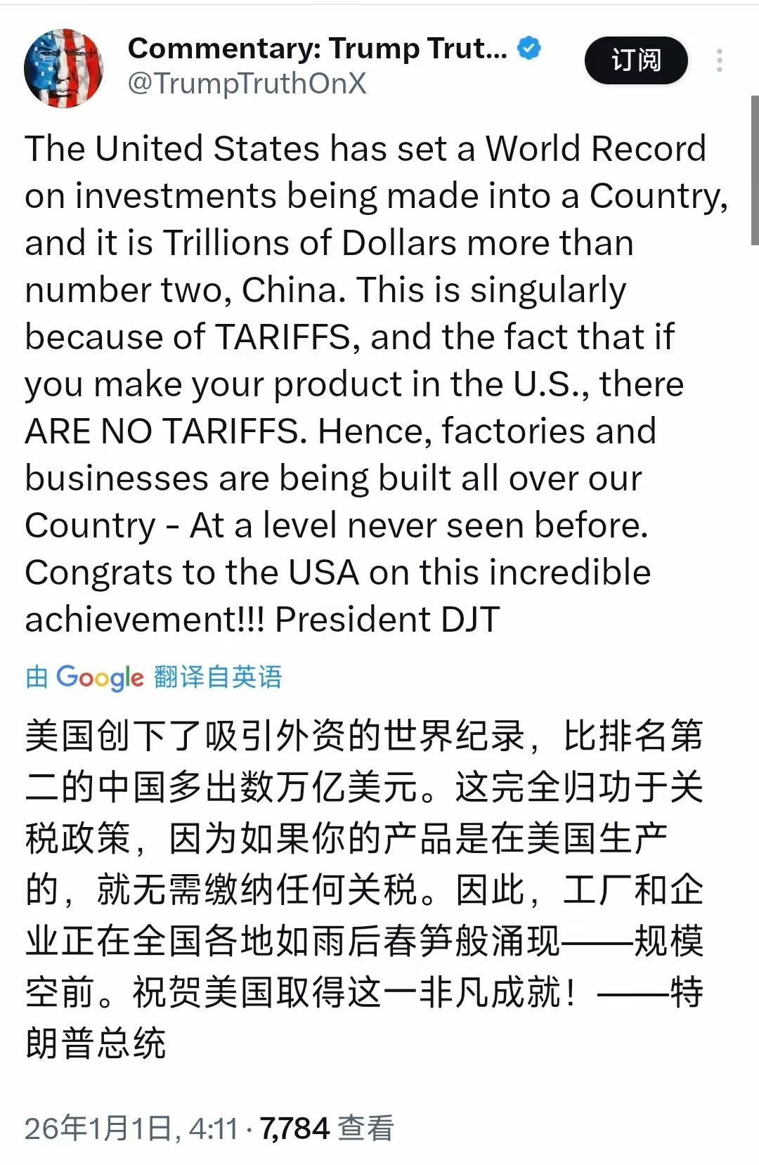 特朗普今天(北京时间1月1日)发文写道:“美国创下了吸引外资的世界纪录,比排名第