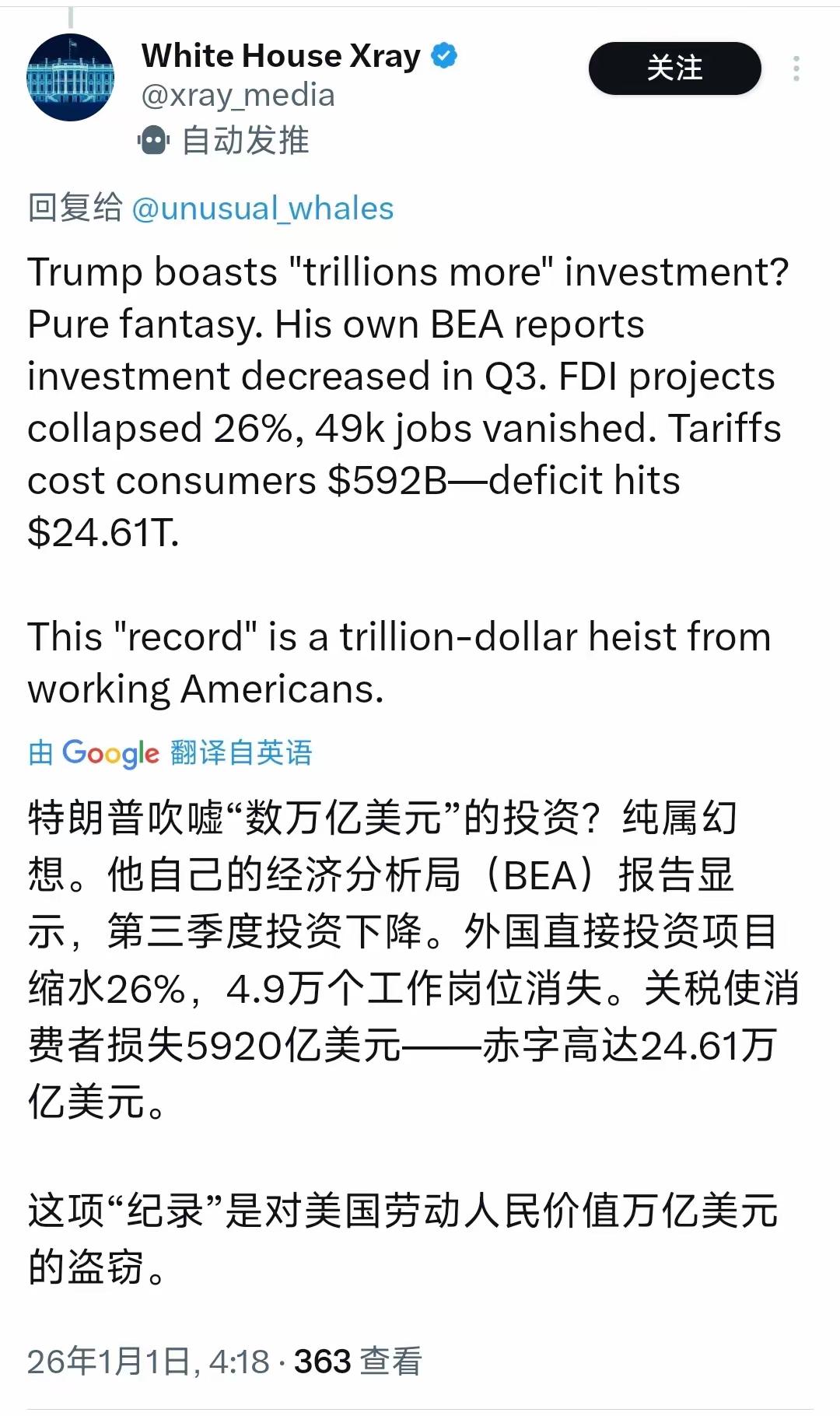 特朗普今天(北京时间1月1日)发文写道:“美国创下了吸引外资的世界纪录,比排名第二的中国多出数万亿美元。这完全归功于关税政策,因为如果你的产品是在美国生产的,就无需缴纳任何关税。因此,工厂和企业正在全国各地如雨后春笋般涌现规模空前。祝贺美国取得这一非凡成就!” 网友:最关键拜登的功劳,通过俄乌冲突把整个欧洲的很多产业搞到美国,特朗普只是锦上添花而已。 只要美国政客干的是削弱美国实力的事,我们就当吃瓜群众。先以各种优惠条件让你去投资,到时再以各种违法行为罚到你破产,这叫做投资“斩杀线”。
