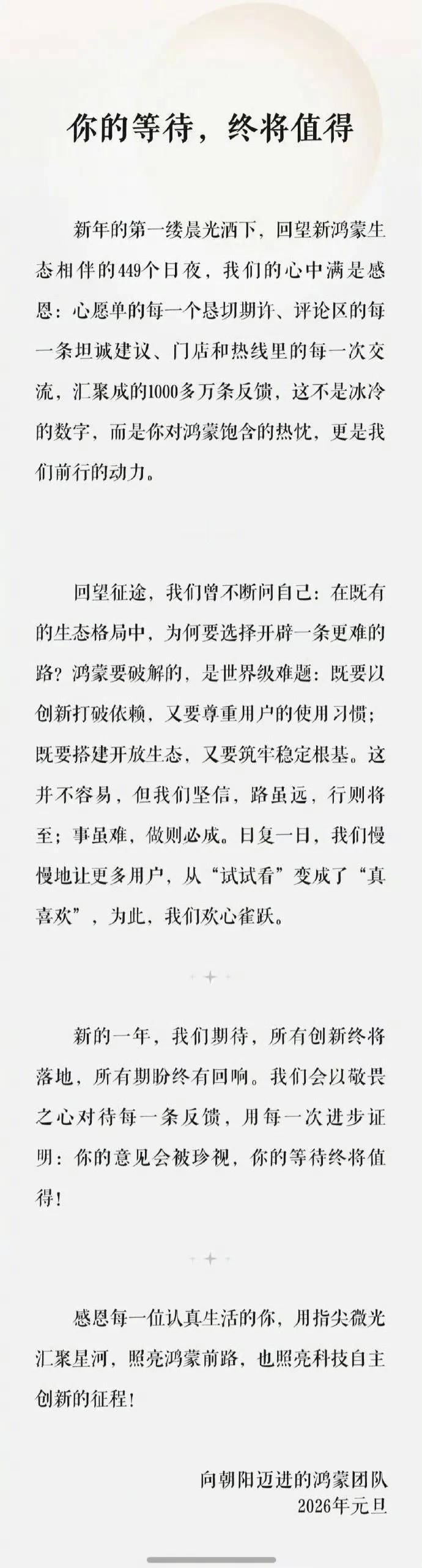鸿蒙团队今日发布新年感谢信,称千万条用户反馈是其前进的动力,并表示将珍视所有意见,以证明用户的期待与等待都值得。 目前HarmonyOS 5&6 终端设备数已破 3600 万,日均新增设备15万+,超35万应用与元服务,站在鸿蒙生态的肩膀上,华为Mate X7折叠屏的发布,更是为用户带来了不错的体验,生活开始变得更舒展、更从容。 像是碰一碰分享视频、隔空传送、评论区调用原相机等等一堆能极大程度提升使用体验和效率,聪头部应用高频适配解锁实用新功能,鸿蒙生态用实力诠释“越用越好用”。