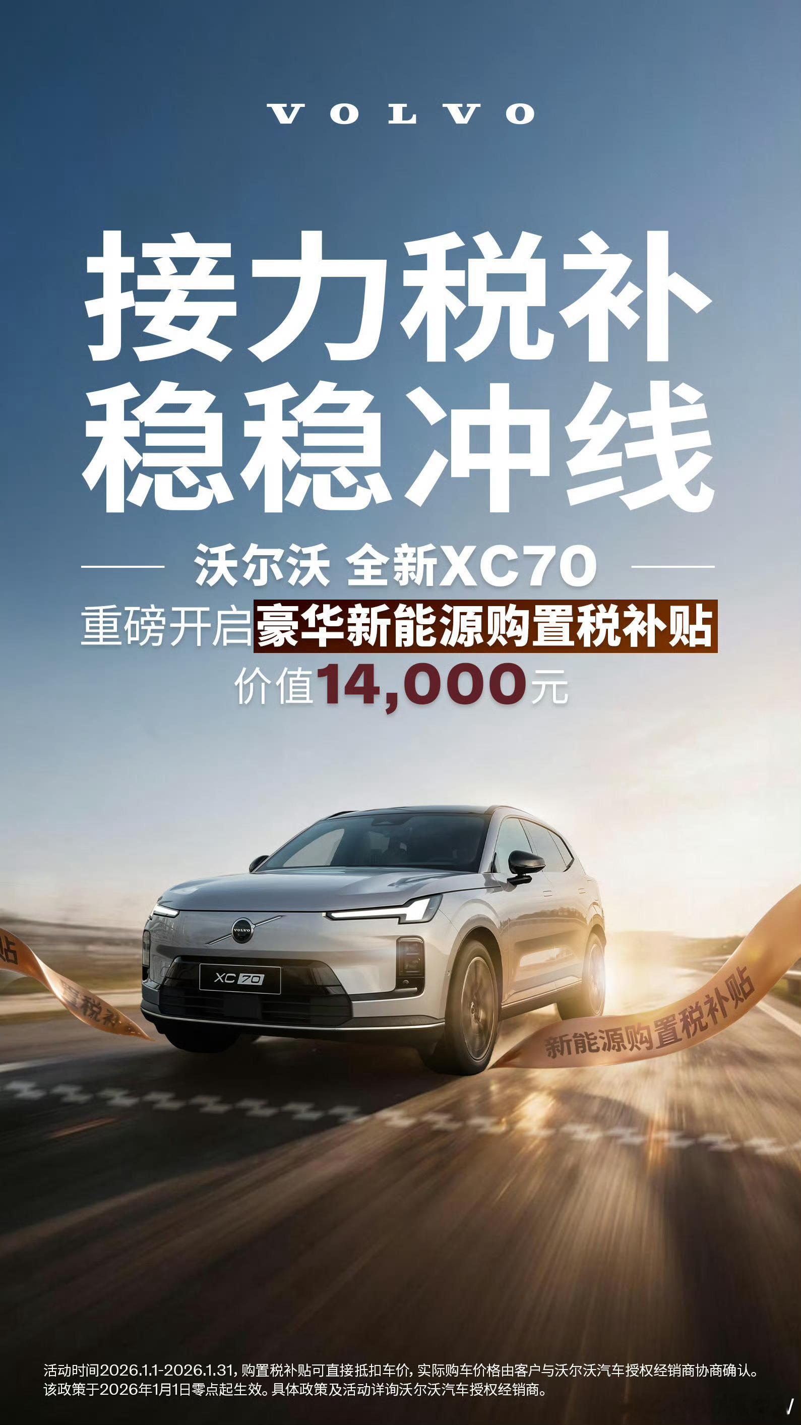沃尔沃新年首推新能源购置补贴2026新能源购置税政策调整,全额免征改为减半征收,购车成本应声上涨!沃尔沃火速推出1.4万专项补贴,精准填平新政差价,还有三年三次免费保养,让性价比不打折