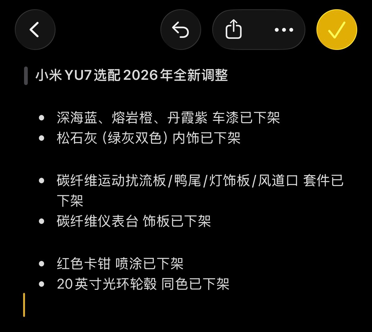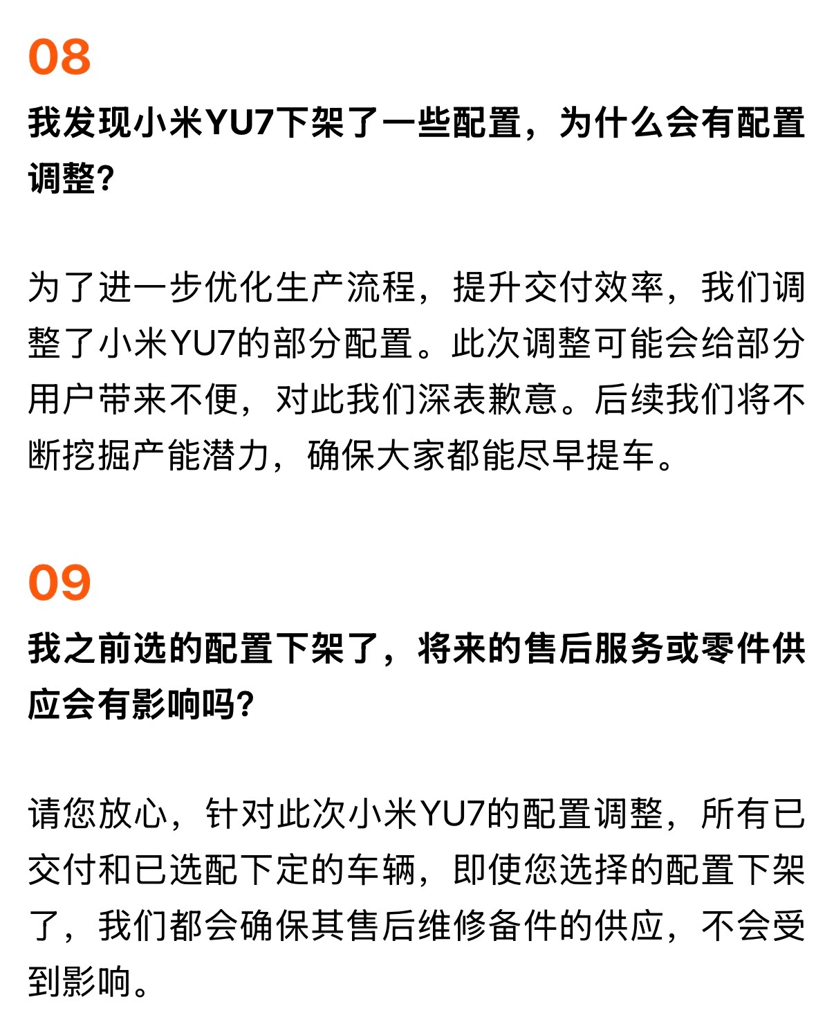 小米回应YU7配置调整正常调整,问题不大……后续原配置出现问题还是给解决的。感觉是把一些用户选的比较少的,或者生产难度高的下架啦。