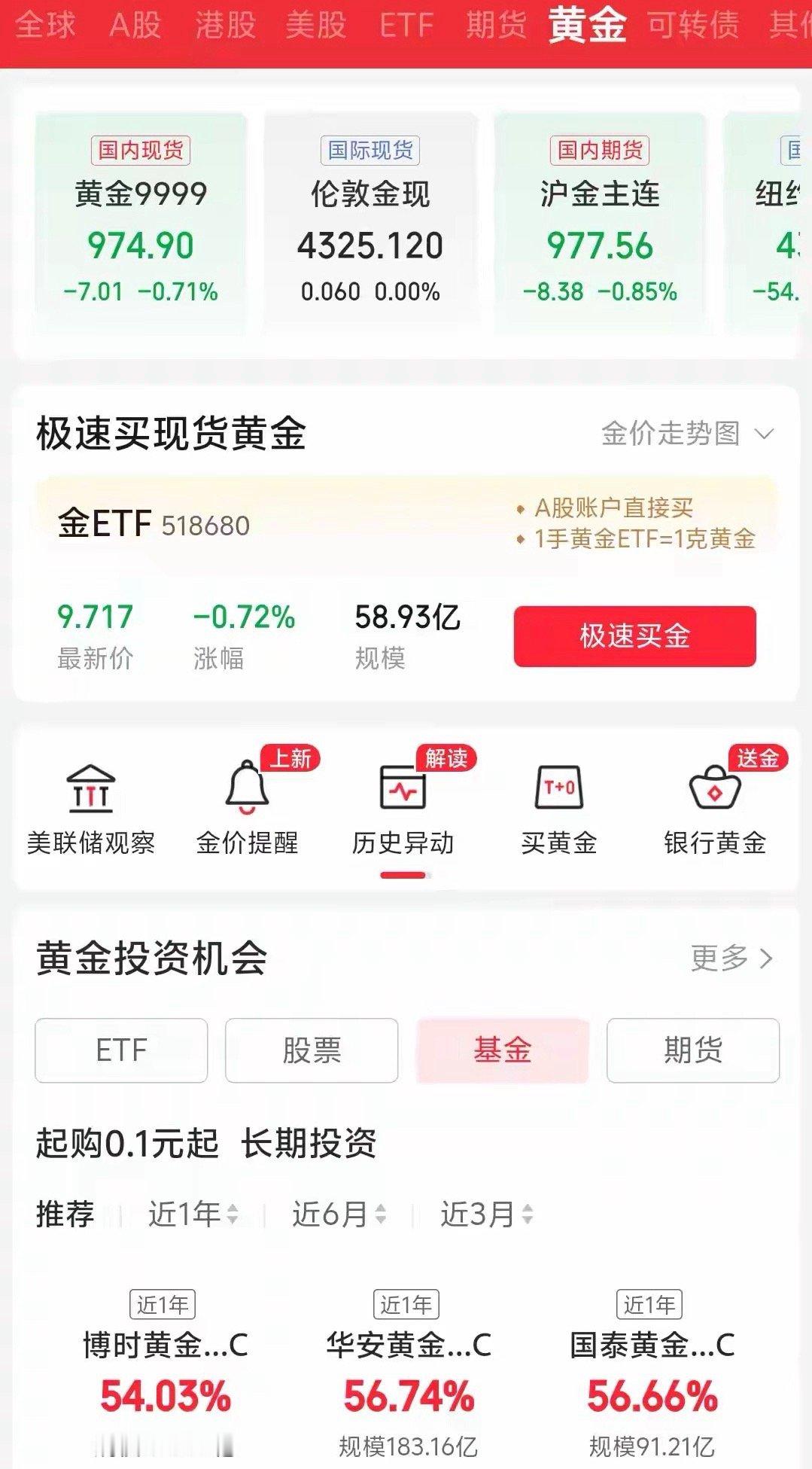金价:今日金价974/克!不出意外的话,下周或迎来更大级别行情“这页行情里的‘平静’,其实是‘风暴前的蓄力’——别光盯着0.71%的跌幅,藏在数据里的‘底气’才是下周行情的关键。”最近不少朋友问“黄金还能涨吗”,今天咱们从这页行情的细节里扒扒——国内现货黄金看似小跌,但两个“反常识”的信号,其实在给“更大级别行情”铺路:一、“短期小跌的背后,是长期资金在‘悄悄蹲守’”你看这页里的黄金基金数据:博时、华安这些产品近1年涨幅都超过54%,规模还在往上涨(博时黄金基金规模都到216.78亿了)。这说明啥?不是“资金在跑”,而是“长期钱没撤”——这些资金买黄金是为了“压箱底”,不是赚快钱,所以短期跌一点根本不会慌,反而会趁波动慢慢加仓。再看国际金价:伦敦金现基本持平(只涨了0.06%),没跟着国内现货大跌,这更说明今天的下跌是“国内短期资金调仓”,不是全球市场看空黄金,属于“自己人动一动,不是外面的风”。二、“下周要起‘大行情’,这两个‘开关’得打开”光有资金蹲守还不够,得等两个“催化剂”来推一把:1. 消费端的“新年刚需潮”:1月本来就是黄金消费旺季——新年给长辈买金饰、婚庆备三金的需求都会起来,要是这几天金店的销量数据涨了,相当于“用真金白银托住了金价”;2. 资金端的“ETF加仓潮”:现在金ETF规模58.93亿,要是下周看到“买入量突然放大”,说明短线资金也开始进场了,“长期钱+短期钱”一起动,行情自然会往上走。这就像“烧水”:现在水温已经到80度了,就差“消费”和“资金”这两把火,把温度顶到100度。当然,要是这两把火只来一把,可能只是“小沸腾”;但要是都来,“更大级别行情”就真的要来了。最后必须说清楚:这是基于当前数据的乐观分析,但黄金价格受国际局势、美联储政策等影响极大,不存在“必然涨”的说法。大家理性看待就好,别盲目跟风。