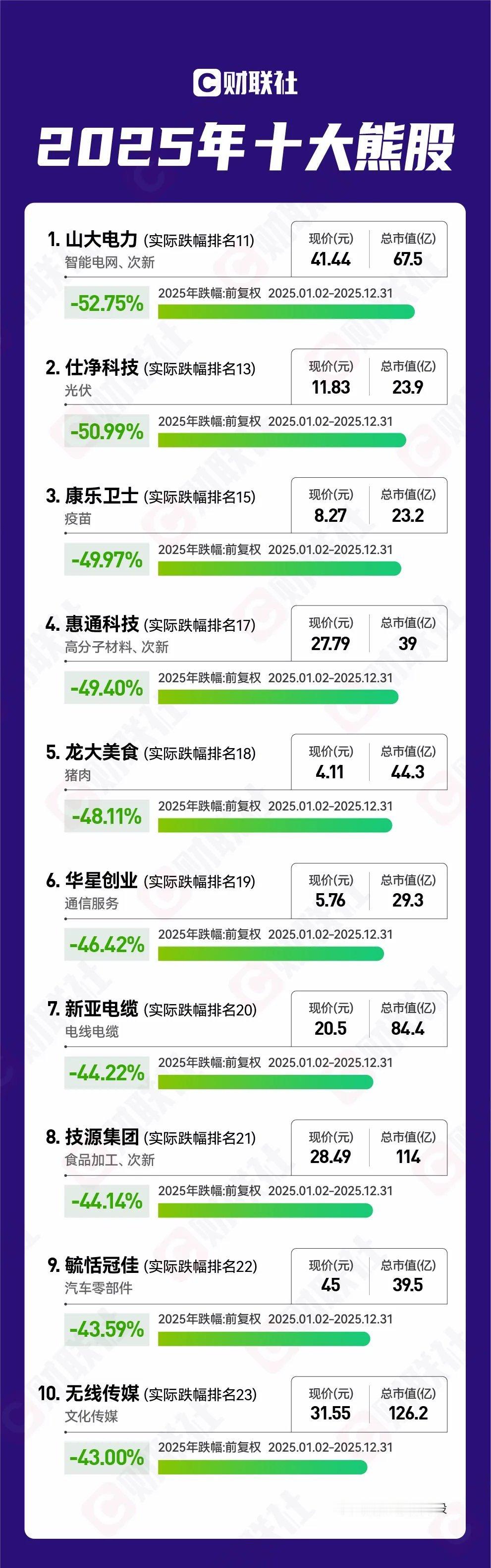 2025年非ST、非退市整理期十大熊股榜(按跌幅排序)1. 山大电力2. 仕净科技3. 康乐卫士4. 惠通科技5. 龙大美食6. 华星创业7. 新亚电缆8. 技源集团9. 毓恬冠佳10. 无线传媒以上榜单仅供参考,如有疏漏不妥,欢迎指正。