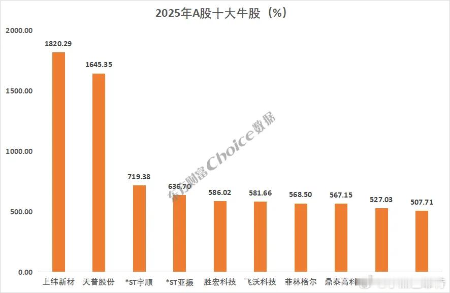 2025年统计 十大牛熊股,上纬新材以1820.29%的涨幅位居全年个股涨幅榜榜首