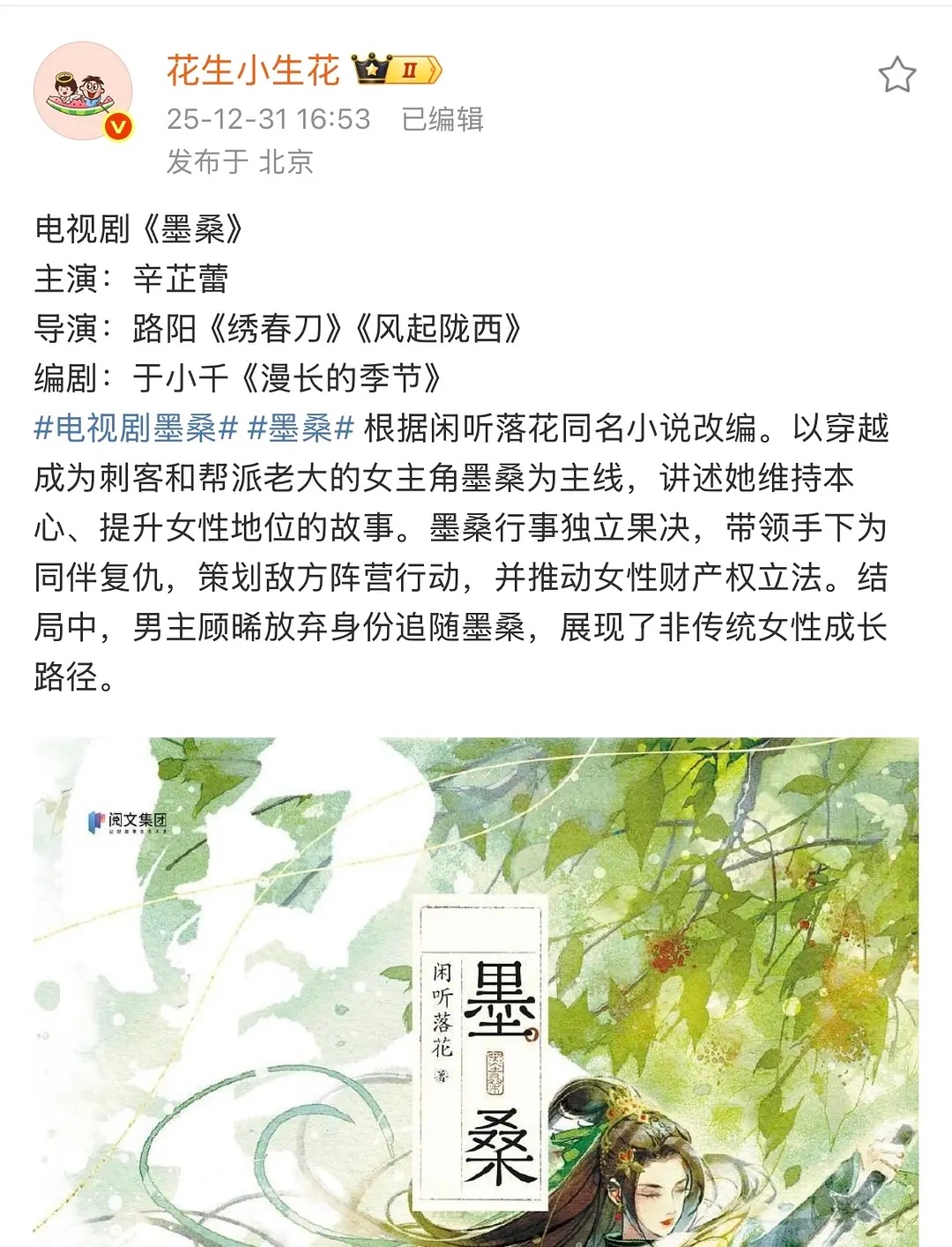 辛芷蕾拍路阳的古偶,必扑啊🤣说起来路阳也是导演界的超级zyk电影几乎都扑街,口碑最好的绣春刀也是扑的电影扑得开不起来,就去拍电视剧,风起陇西 天启异闻录都是大制作,还血扑刺杀小说家2又扑狠了吧,男频大制作开不起来就开女频古偶,总有投资方上当,这个古偶集均1500都很难的长剧市场也敢来 为了好听说是武侠片,无论电影电视,武侠都没市场好么?还不如古偶