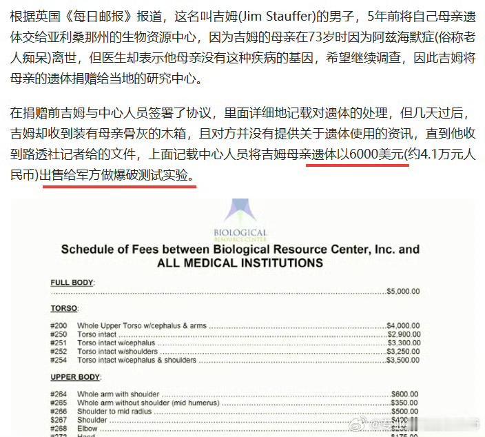 细思极恐!2019年美军惊天丑闻:竟花钱买平民遗体做爆炸实验,绝非个例太丧心病狂! 2019年爆出的这桩美军丑闻,放到现在看依旧让人毛骨悚然,刷新三观底线!谁能想到,打着医学研究旗号的遗体捐献,居然会被偷偷卖给美军当成爆炸实验的工具,更可怕的是,这绝对不是唯一一具被残害的遗体,背后的真相简直让人不寒而栗。 美国亚利桑那州的吉姆,当初为了给医学研究出份力,也想着能助力阿尔茨海默症的相关研究,忍痛将母亲的遗体捐给了当地知名的生物资源中心,双方还签了明确协议,特意注明拒绝任何军事相关实验。可谁能料到,这份善意最终却变成了无法挽回的伤害,这家机构压根没遵守约定,直接以5893美元一具的价格,把吉姆母亲的遗体卖给了美军做爆炸测试。 实验过程更是残忍至极,逝者的遗体被强行绑在特制座椅上,美军直接引爆爆炸物,全程只为测试车辆遭遇爆炸时人体的承受能力,完全没把逝者当回事。事后吉姆只收到了母亲的一只手的骨灰,其余遗骸彻底不知所踪,得知真相的他崩溃不已,却迟迟讨不回公道。 这还只是冰山一角,绝非个例!根据当时BRC机构和美军的相关记录显示,至少有20具平民遗体,都是在未经家属同意的情况下,被偷偷卖给美军用于同类爆炸实验,美军对此却一味推脱,声称全程都相信机构所说的“已获家属授权”,全程甩锅毫无担当。 后续警方的突袭调查更是爆出惊天内幕,早在2014年,警方就曾突击检查这家生物资源中心,当场搜出1755块人体残肢,装了整整142个尸袋,总重量高达10吨,机构老板长期打着医学研究的幌子,非法倒卖遗体及其部位牟利,各个部位明码标价,形成了一条完整的黑色产业链。 可让人愤怒的是,犯下如此天理难容的罪行,机构老板最终仅仅被判了缓刑和少量罚款,这样轻飘飘的惩罚,根本无法慰藉逝者和家属。很难想象,还有多少逝者的遗体被偷偷用于这类残忍实验,美国人的遗体看似“宽裕”,实则全是被这条黑色产业链肆意践踏,连逝者都不放过,美军和黑心机构的所作所为,简直丧尽天良,让人看完怒火中烧!