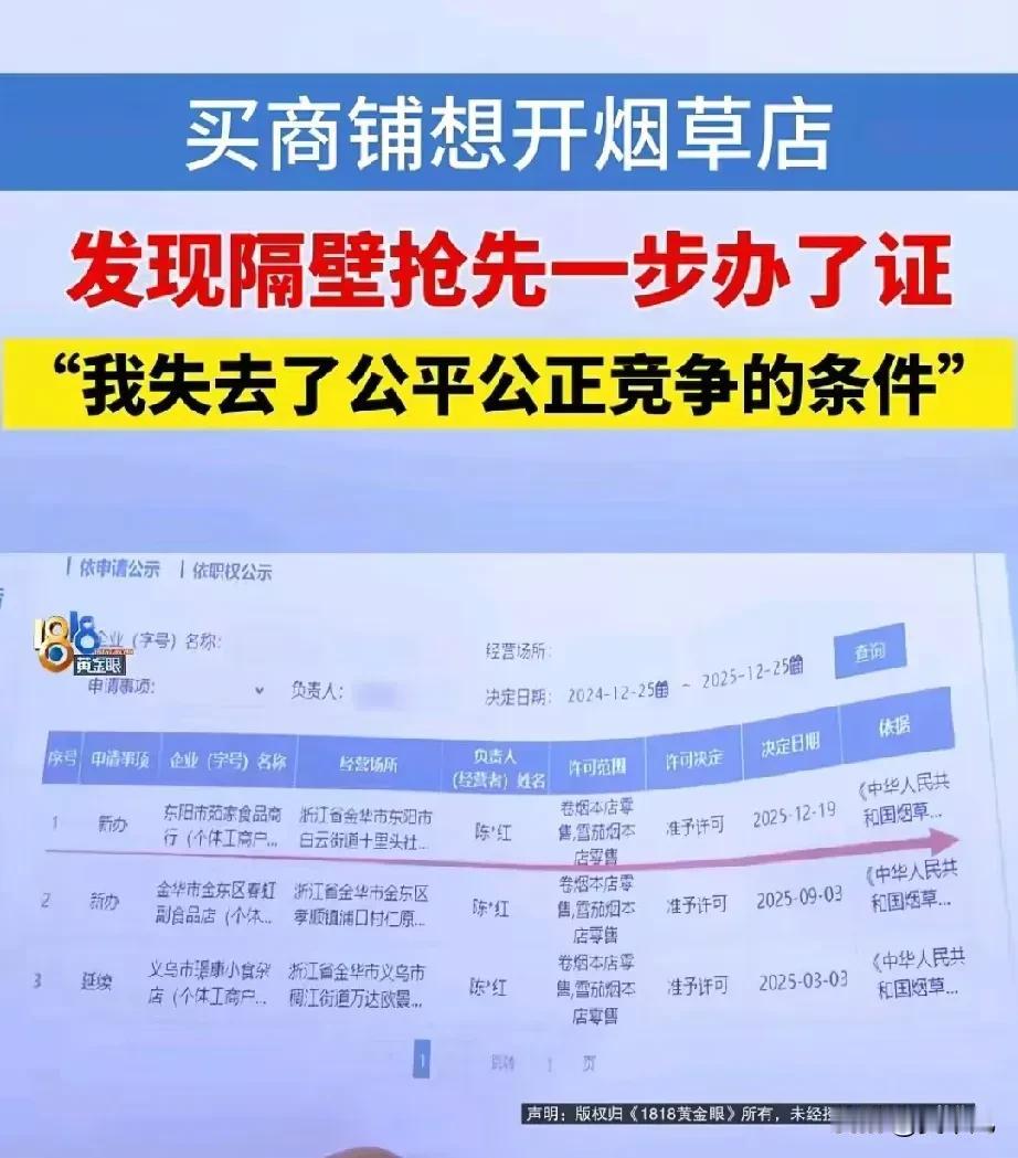 这事儿听着就让人窝火!浙江金华的周女士,最近真是遇上了大麻烦。 她看中了一个临街的好铺子,想开家烟酒店。为了抢到这个“香饽饽”,周女士二话没说,在12月17号那天,爽快地掏了10万块钱定金,签了合同,就等着开发商走下一步手续(网签)了。 开烟酒店不是光有铺子就行,关键还得办两个“证”:一个是营业执照,一个是烟草专卖许可证。周女士早就盘算好了,连店里的货架都订好了,就等着手续齐备后大干一场。 可谁能想到,就在她等着办手续的这几天,一个晴天霹雳砸了下来:她隔壁那间还没卖出去的铺子,居然已经神不知鬼不觉地把营业执照和烟草证都办下来了! 周女士一听,脑子“嗡”的一下。这太不正常了! 第一,那铺子的产权还在开发商手里呢,根本没卖出去,也没过户,“营业执照”是怎么办下来的?谁给它做的登记? 第二,更邪门的是,办烟草证要求可严了,店里得有货架、得像模像样能开门营业才行,而且附近一定距离内不能有另一家烟酒店。可那间铺子到现在还是毛坯,空空如也,这“烟草证”又是怎么拿到手的? 周女士心里直犯嘀咕:这背后肯定有猫腻!她怀疑,是不是有人通过开发商的关系,提前开了什么“后门证明”,才让这些手续办得如此“神速”?更让她憋屈的是,这样一来,因为距离限制的规定,她的烟酒店根本没法开了——生意还没开始,就被别人用这种“非常手段”给堵死了路。 她找到开发商理论,对方却推三阻四,不给明确说法。她又气又急,觉得自己的公平竞争权利被彻底剥夺了。 后来,周女士把事情反映给了市场监督管理局。官方查询显示,隔壁那家店是在周女士交定金的前一天(12月16日)网上提交的申请,第二天(17日)执照就批了,紧接着19号烟草证也到手了。速度之快,令人咋舌。 这事儿到底问题出在哪?咱们老百姓也能看明白几点: 1. 办执照的“地址”可能有问题:那个铺子自己都还是个“没主”的(产权未过户),拿它当经营地址去办执照,提供的场地证明文件是不是真实、合法?这里头开发商开出的证明是关键,万一这证明有问题,那执照的合法性就得打问号。 2. 办烟草证的“条件”绝对有问题:一个空荡荡的毛坯铺子,是怎么“具备正常经营条件”的?是怎么通过现场核查的?这里头审批环节很可能存在疏漏,甚至是不合规的操作。 3. 速度“快”得不正常:从申请到拿证,快得离谱,明显违背常规办事流程,很难不让人怀疑是不是走了什么“特殊通道”。 周女士该怎么办? 她不能吃这个哑巴亏!她可以: 继续要求市场监管部门深入调查:紧盯隔壁商户办执照时用的那份“经营场所证明”到底是怎么来的,是不是合法有效。如果查实材料有问题,完全可以要求撤销那张“早产”的营业执照。 向烟草专卖局提出异议和举报:明确指出对方店铺根本不具备申请烟草证的硬件条件,要求他们对发证过程进行复查,并申请撤销那张涉嫌违规取得的烟草证。 保留法律途径:如果相关部门不处理或处理不公,她完全可以凭借手上的认购合同、定金凭证等证据,去法院起诉,维护自己合法的经营权和公平竞争的权利。 总的来说,周女士的遭遇凸显了在商业竞争中,程序公正和透明度的重要性。这件事不能就这么糊弄过去,必须查个水落石出,给守规矩的投资者一个交代,也把那些可能存在的“暗箱操作”晒在太阳底下。