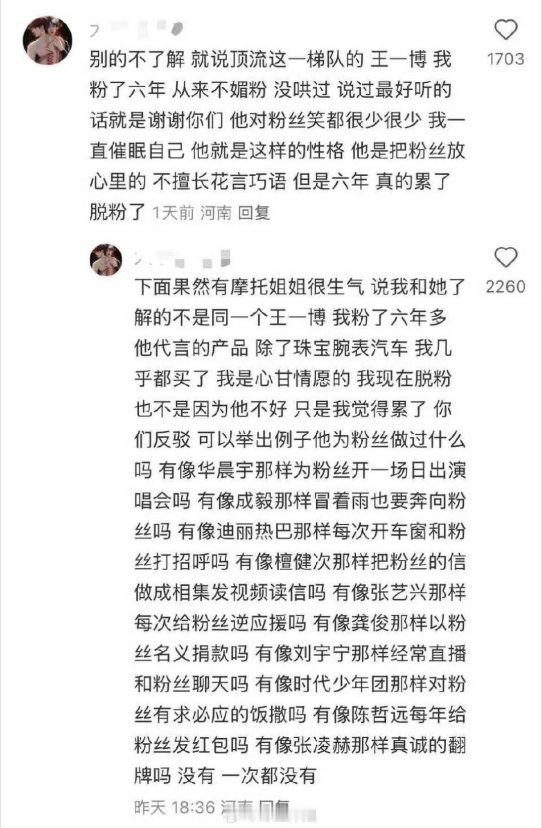 王一博最近好像好多粉丝脱粉了,还有脱粉的粉丝发小作文了,说王一博事业心太弱了,动不动就说累,拍拍vlog就算工作,但粉丝不买这个账,你咋看呢?