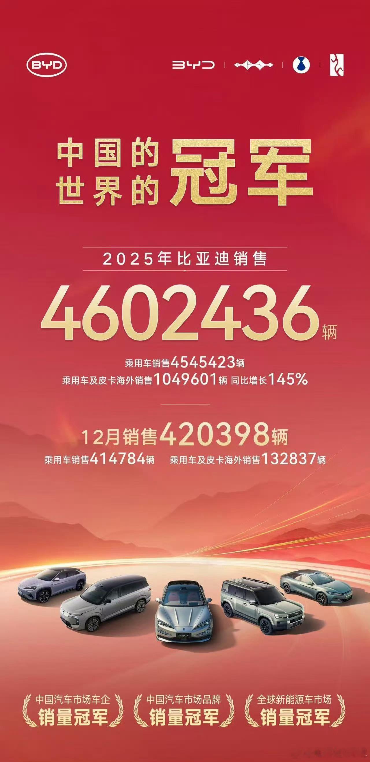 比亚迪12月销售420398辆,其中海外132837辆!全年累计 4,602,436辆,同比增长7.73%。兄弟们我又完美预测这个月销量了,粉丝交流群都知道,还有谁
