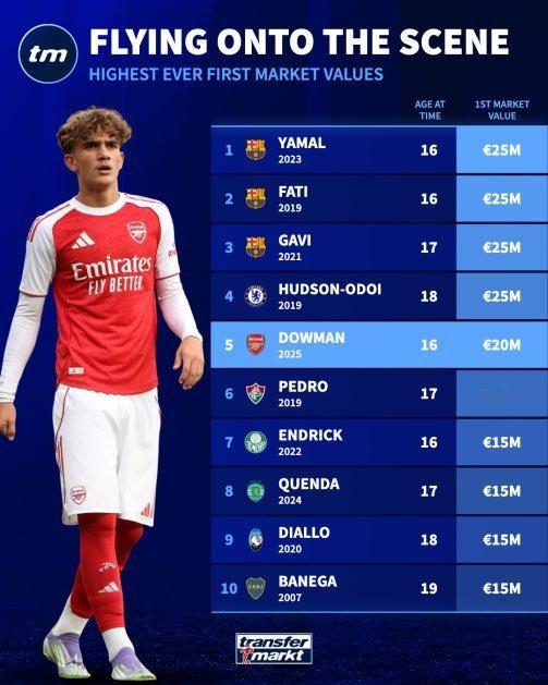 在昨天年满16岁后,阿森纳青训小将马克斯·道曼在德国转会市场网站上获得了2000万英镑的初始身价。这一估值使他位列有史以来所有球员初始身价的第五高。💰阿森纳 英超联赛 道曼