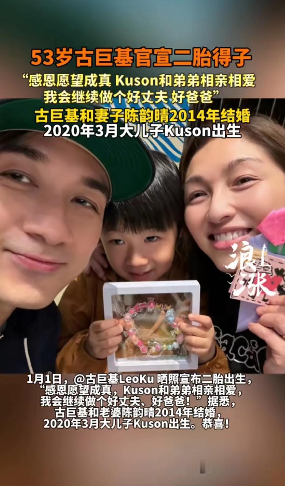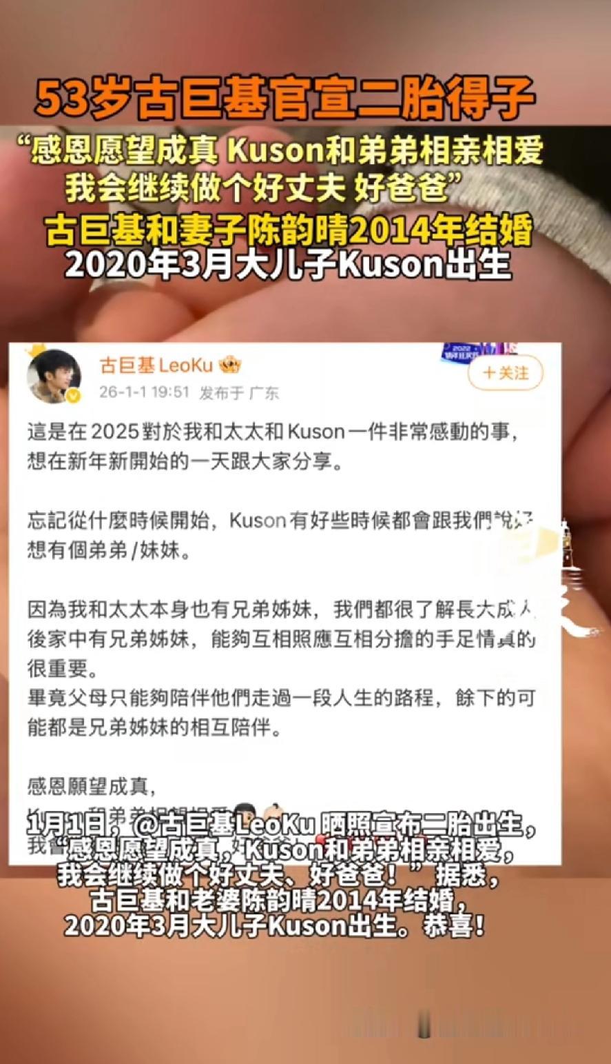 53如果古巨基官宣二胎得子,2026 年元旦,53 岁的古巨基官宣二胎得子,一家四口的牵手照太暖了,直接冲上热搜。想当年,他在《情深深雨濛濛》里演的何书桓可是迷倒了不少人,还有那首《好想好想》,至今都让人难忘。 古巨基和妻子陈韵晴的爱情长跑也很让人感动,从 1993 年相识,到 2014 年结婚,整整 20 年。戏里戏外的书桓对感情都很专一。 古巨基在娱乐圈打拼多年,没有任何绯闻,跟妻子结婚多年也没有乱七八糟的新闻,现在又添二胎,真是妥妥的人生赢家。 这次生二胎,是因为长子 Kuson 总念叨想要弟弟妹妹。要知道,57 岁的陈韵晴可是高龄产妇,2020 年生一胎时就 52 岁了,这次拼二胎风险比普通产妇高 12 倍。这个年龄生二胎真是太拼了,还好心愿达成,愿望成真,希望他们一家一直幸福下去!