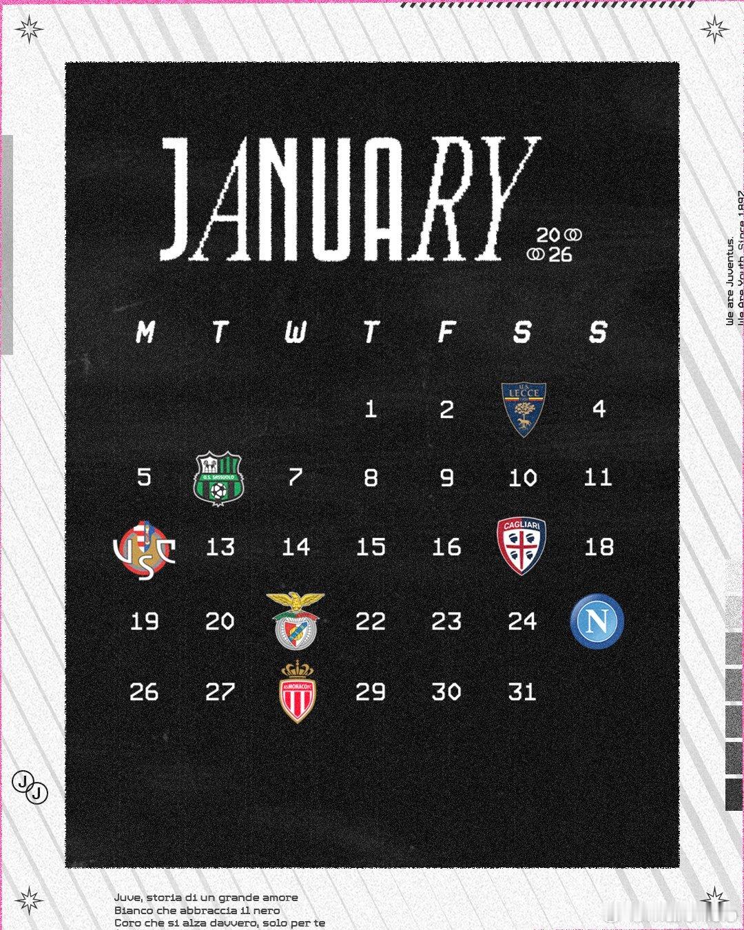 你妇新年第一个月的赛程,前半段的莱切、萨索洛、克莱默内塞和卡利亚里相对好打,后半程的本菲卡、那不勒斯和摩纳哥堪称魔鬼,加油,5胜2平争取下?尤文图斯欧冠联赛新年快乐