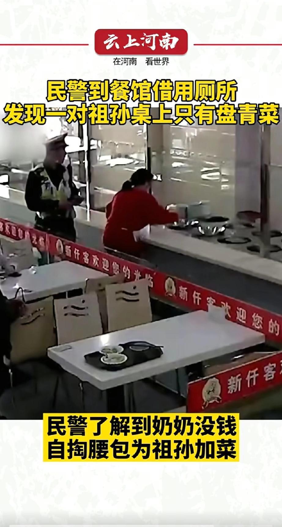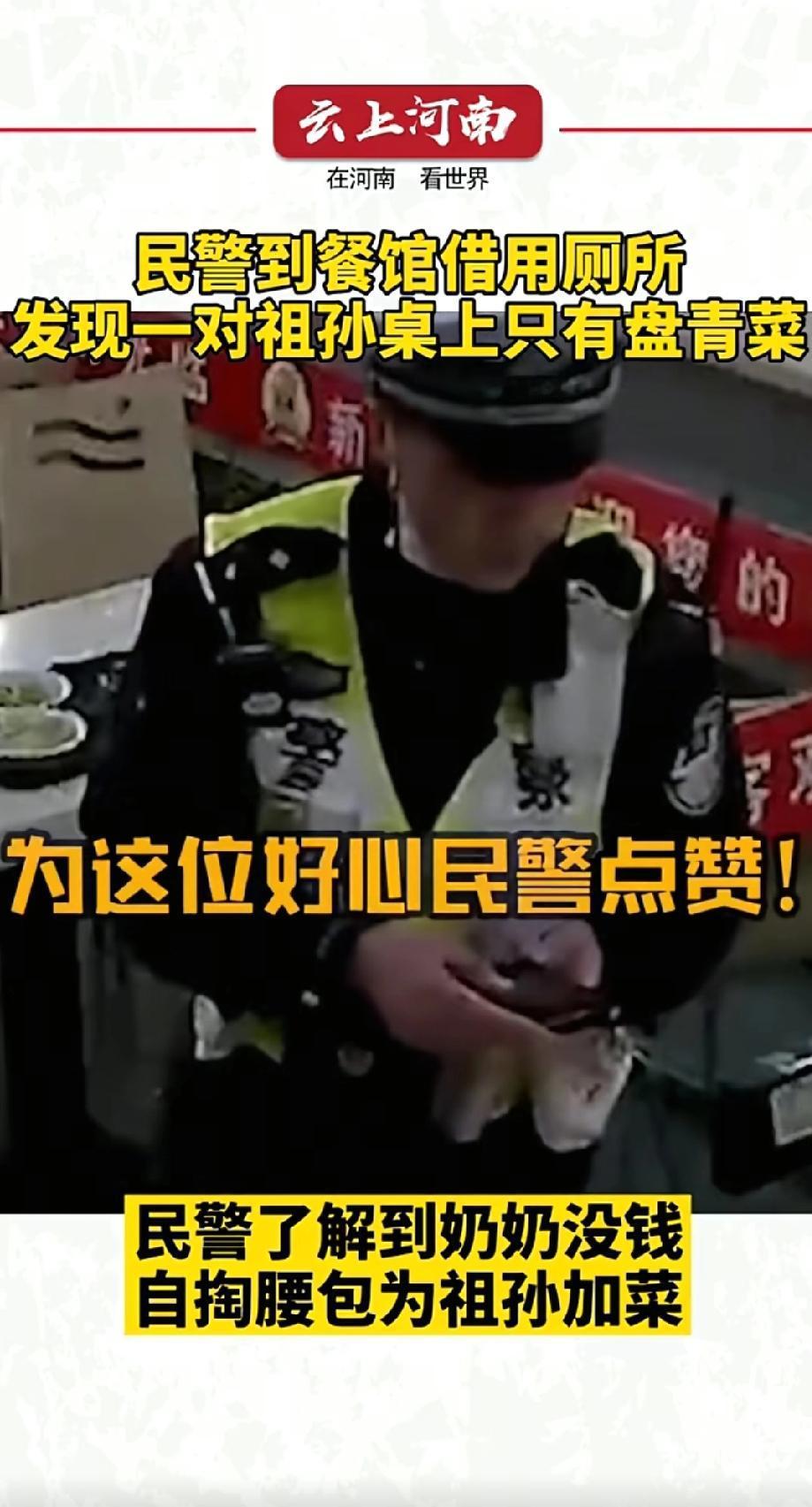 看哭了!上海一餐馆内,祖孙俩围着桌子吃饭,忽然进来名民警。他急匆匆经过餐桌时,好象发现了什么,特意看了一眼后,快步走向洗手间。 很快,民警从洗手间出来。他走到祖孙两人跟前,桌上摆一盘青菜,一碗饭,孩子低头吃饭,老人坐桌子对面,默默看着。 民警对老人说:“你们刚刚吃午饭,就给她吃个青菜啊!”老奶奶愣了一下,不明白吃个饭怎么被民警盘问,她懵了,机械地点点头。 民警接着说:“孩子正是长身体时候,要吃点肉呀。”老奶奶眼眶红了,表示自己没钱了,只够给孩子买这些吃的。民警听到老人如此说,心揪了一下,转身对餐馆老板说:“给她们加两个菜,我帮她们付掉。” 民警到窗口付钱,忽然又想起什么,对老奶奶说:“你也没饭吃吧,再给她(老奶奶)加个饭。” 餐馆老板立刻忙碌起来,给祖孙两人炒了两盘肉菜,又端来一碗米给老人吃。 民警本是到餐馆借用厕所,没想到刚进门他就发现了这对蜷缩在角落的祖孙,还有那盘寒酸的青菜。 只是匆匆一眼,他立刻察觉到老人的困境,并慷慨解囊,让老人和孩子吃上了热乎乎的饭菜。 不知老人遇到什么困难,连吃饱饭都成奢望。但在这个冬天,这位民警的举动如同冬阳,温暖了老人和孩子的心。这不只是一口热乎饭,更是善良人的担当和关爱。 可爱的人选择了正义的职业,他对得起身上的衣服。 当我们第一眼看到这身衣服时,首先是安全与信任。警察也是人,也是挣钱养家的普通人,可这一刻,他凭职业敏感,发现困顿的祖孙俩,及时伸出援手,自掏腰包为陌生人买单。 他穿这身衣服负有为人民服务的责任,但我们也不应理所当然享受警察的爱心。学会感恩,相互成就,社会气象才能更加向上向好。 2026年第一天,看到如此温馨的故事,希望新的一年都是美好。 资料:绿春融媒