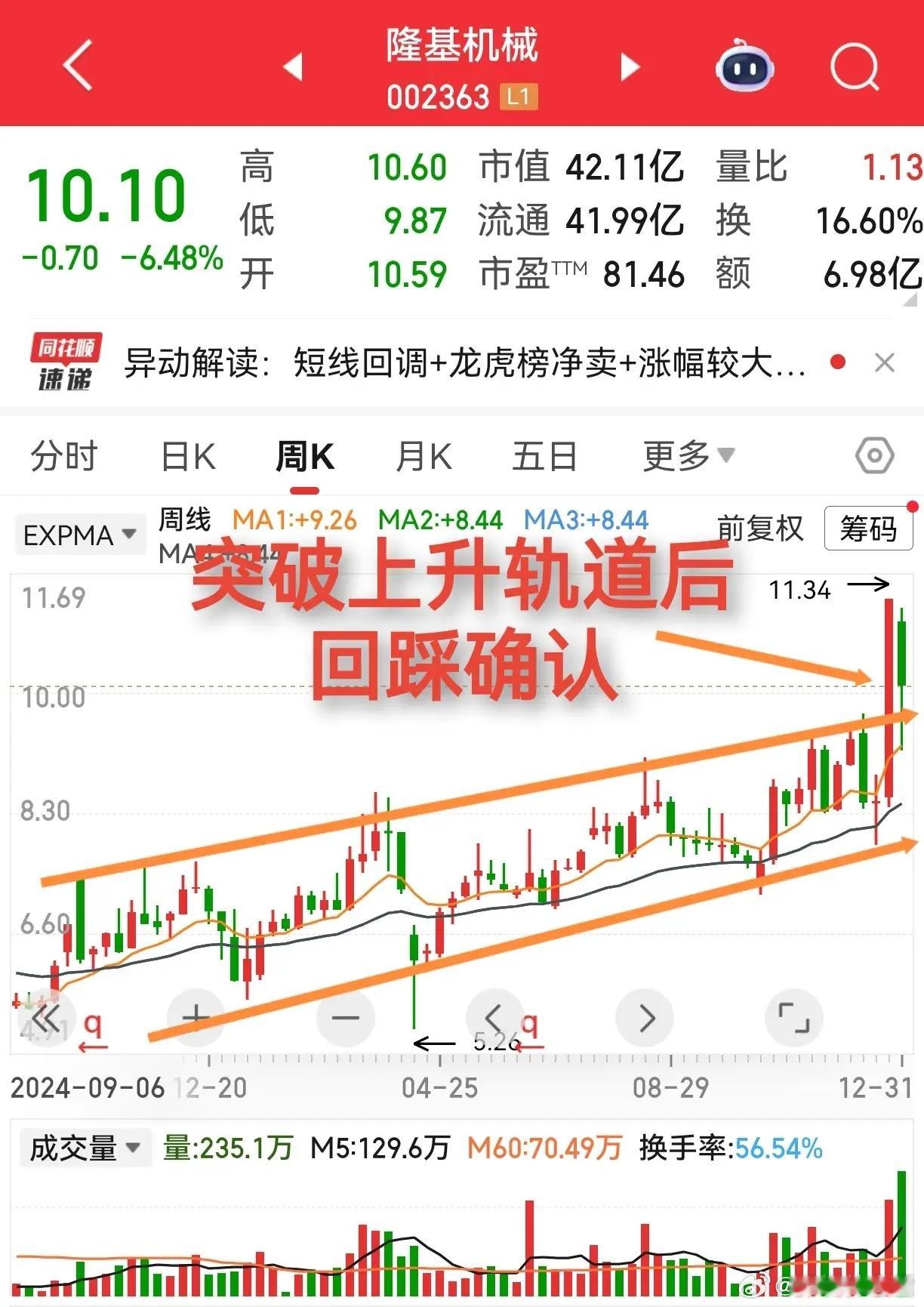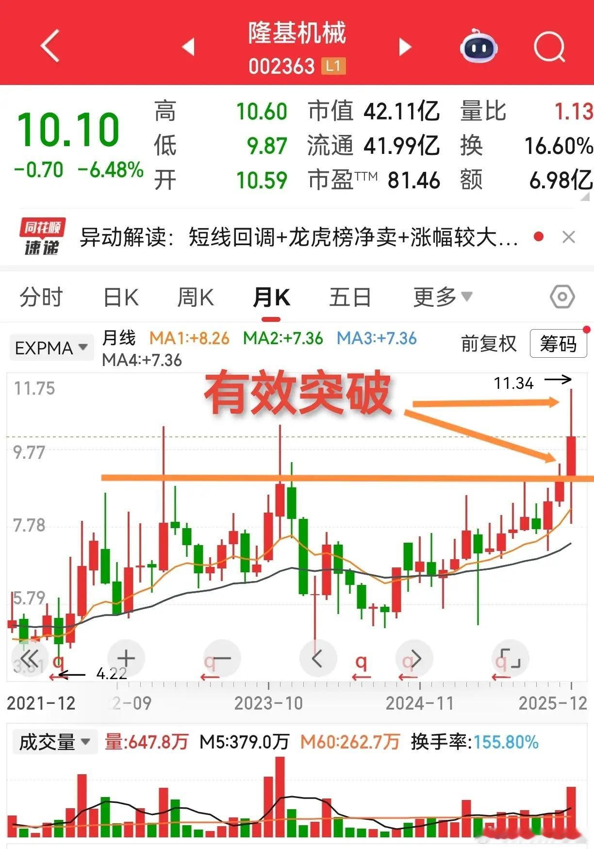 突破回踩确认企稳,往往就是主升行情的启动信号!隆基机械,手握商业航天、军工、数字经济、华为等多重热门概念,赛道优势突出。走势上,三连板后回调洗盘:前两板一字无量惜售,第三板放量换手;跌停反抽+缩量下跌,震仓彻底出清获利盘与恐慌盘。周线突破上升轨道,回踩上轨是关键考验;月线突破长期平台,有效性有待回踩验证。一旦企稳回升,主升浪值得期待!