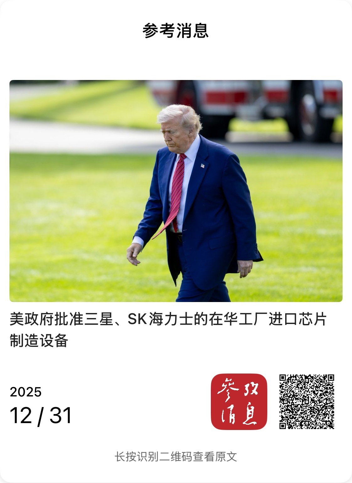 【美政府批准三星、SK海力士的在华工厂进口芯片制造设备】 (参考消息 2025-12-31 14:07:19 ) 参考消息网12月31日报道 据路透社12月30日报道,知情人士30日表示,美国政府已向三星电子和SK海力士授予年度许可证,允许它们在2026年将芯片制造设备引入其在华工厂。 报道称,此次批准对韩国企业而言是暂时的缓解。美国在今年早些时候曾决定撤销给予部分科技公司的许可证豁免。 此前美方对三星、SK海力士和台积电实施豁免,使它们免受对华芯片相关出口全面限制的影响。但这项特权将于12月31日到期,这意味着此后美国芯片制造设备运往它们在中国的工厂将需要美国的出口许可证。 特朗普政府急于限制中国获取美国芯片技术,一直在重新审查其认为在拜登政府时期过于宽松的出口管制。 报道指出,全球排名前列的存储芯片制造商三星电子和SK海力士将中国视为主要生产基地之一,特别是传统存储芯片的生产。由于人工智能数据中心的需求和供应紧张,传统存储芯片的价格一直在飙升。 (编译/王海昉)网页链接