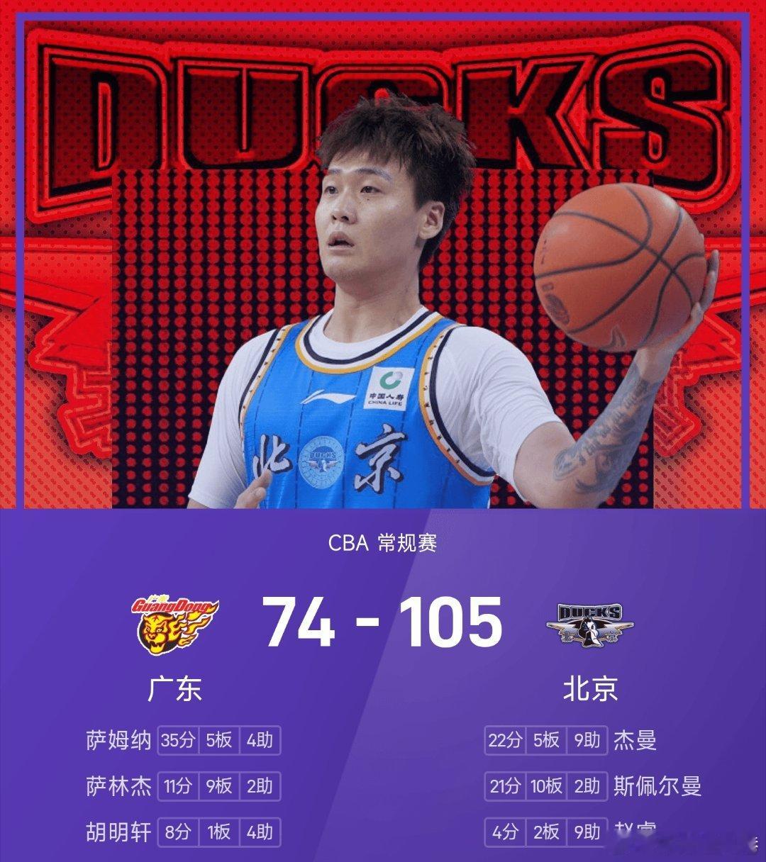 北京男篮vs广东男篮cba新年大战 北京105-74战胜广东北京外援杰曼得到22分5板9助,曾凡博赛季首秀独得18分率队取胜;广东外援萨姆纳空砍全场最高的35分5板4助,徐杰伤退。