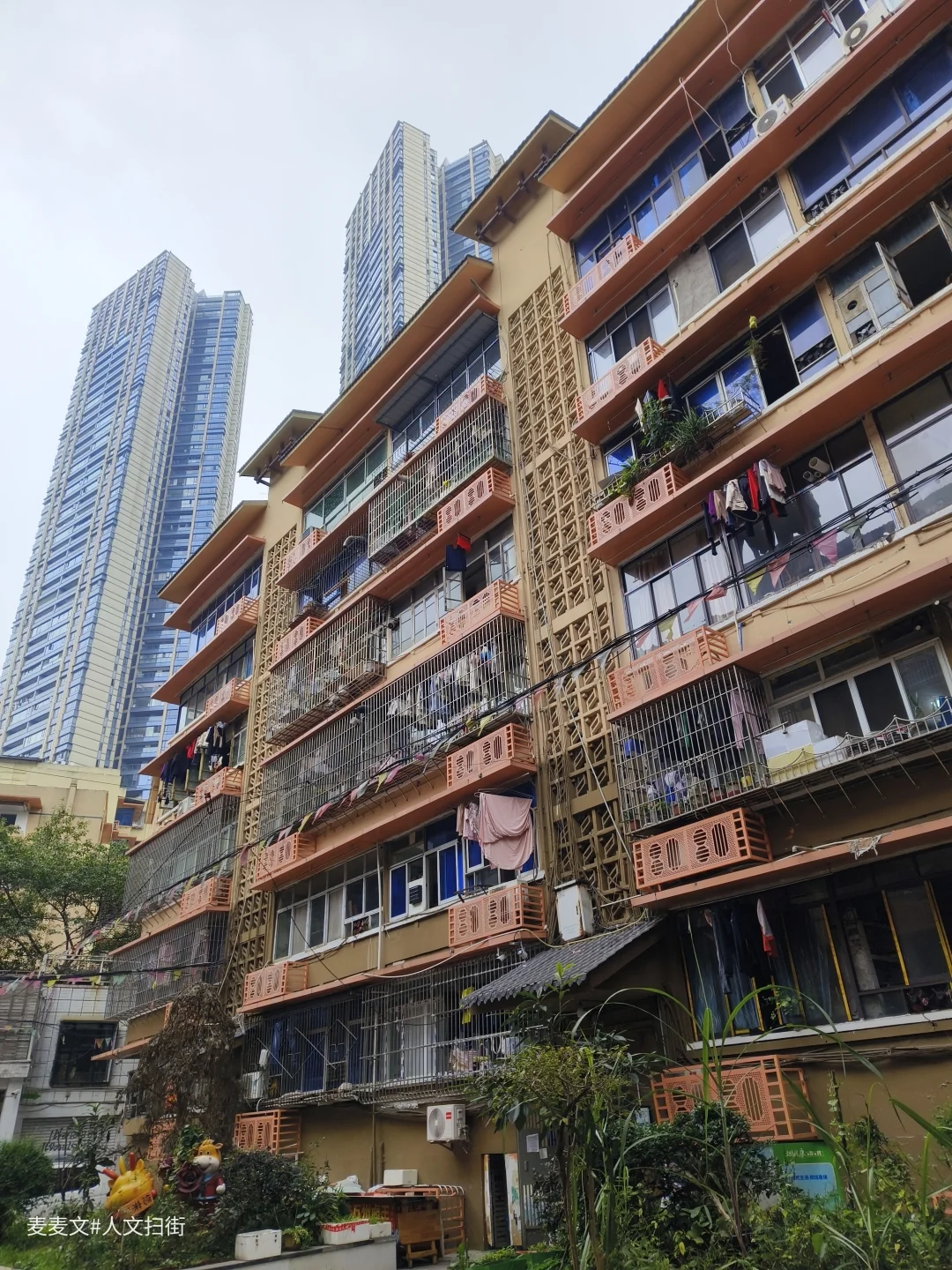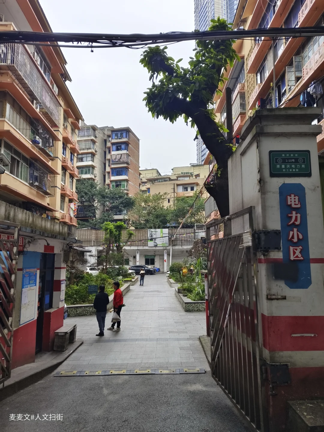 位于重庆市南岸区南坪新街的电力小区,是原重庆电力局的职工家属院。斑驳的门柱上,“电力小区”四个红漆字已有些褪色,一旁的路牌还清晰标注着“原重庆电力局职工家属院”的身份。老旧居民楼的外墙带着岁月痕迹,空调外机、晾晒的衣物勾勒出生活烟火,与远处的现代高楼形成鲜明对比。