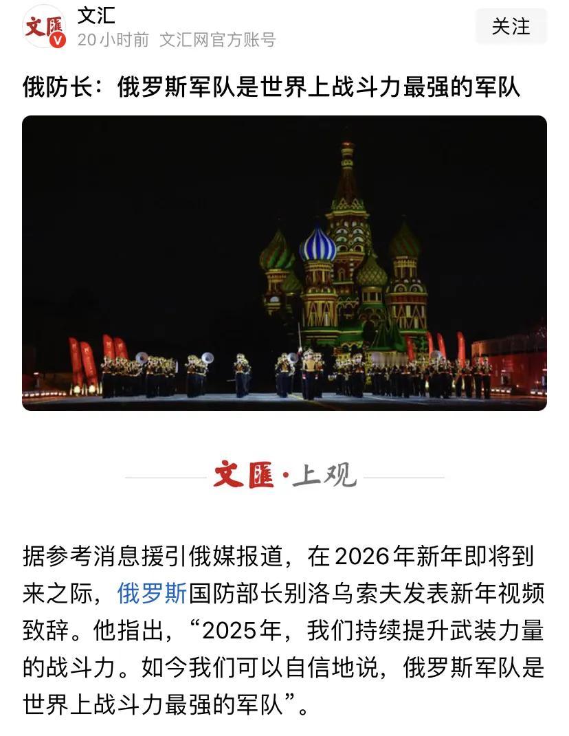 俄防长一句话让世界目瞪口呆:俄罗斯军队是世界上战斗力最强的军队! 如果说,俄罗斯军队是世界上战斗力最强的军队之一,恐怕全世界都得认;但俄罗斯防长别洛乌索夫在2026年新年致辞中,却是自信满满的说,“2025年,我们持续提升了武装力量的战斗力。如今我们可以自信的说,俄罗斯军队是世界上战斗力最强的军队”。 估计别洛乌索夫的这个观点,至少有两个国家应该会有不同看法。 第一个是美国。 2025年10月29日,在横须贺美军基地“乔治·华盛顿”号航母上,特朗普称“美国拥有世界历史上最强大的军队,没有任何一支军队能与我们相比”。 如果俄军战斗力最强,那美军排第几? 第二个是乌克兰。 毕竟俄乌冲突已经马上4年了,尽管乌军得到了几乎所有国家的支持,尽管乌军的伤亡人数高出天际,尽管乌克兰已经丢了约20%的领土,尽管乌军与乌政府还饱受腐败困扰,但是,乌军仍然在前线与俄军打得有来有往。 如果俄军排第一,难道乌军排第二? 所以,当别洛乌索夫对俄军的评价传出后,世界真的有些目瞪口呆:如果真的战斗力最强,恐怕特别军事行动早就应该结束了吧?