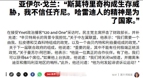 以色列反对派领导人亚伊尔·戈兰批评以色列财政部长斯莫特里奇威胁国家的生存,并对新任“辛贝特”特务头子齐尼的背景(内塔尼亚胡家族的白手套)感到担忧。关于今年的选举,他主张与拉皮德、利伯曼、埃森科特和贝内特逐渐联合政府。