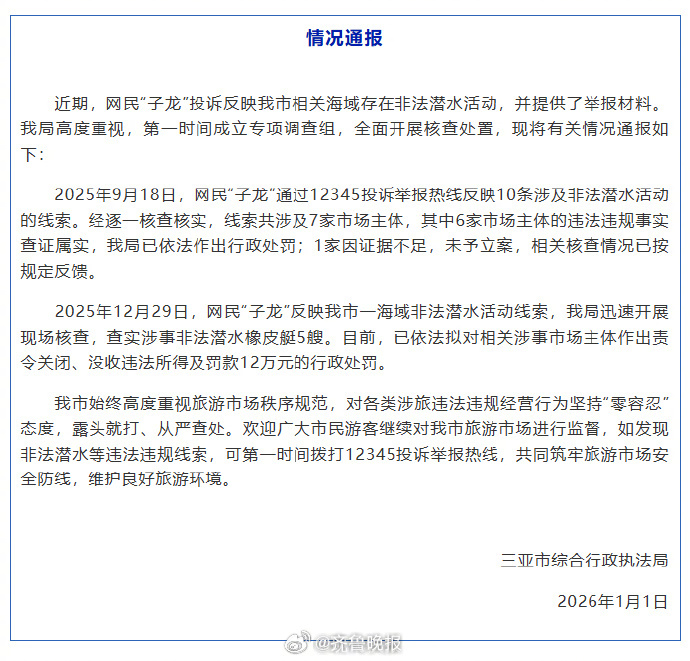 #三亚被举报非法潜水涉事主体被罚#【#三亚通报网民举报相关海域非法潜水#】三亚市综合行政执法局2026年1月1日通报:近期,网民“子龙”投诉反映我市相关海域存在非法潜水活动,并提供了举报材料。我局高度重视,第一时间成立专项调查组,全面开展核查处置,现将有关情况通报如下:2025年9月18日,网民“子龙”通过12345投诉举报热线反映10条涉及非法潜水活动的线索。经逐一核查核实,线索共涉及7家市场主体,其中6家市场主体的违法违规事实查证属实,我局已依法作出行政处罚;1家因证据不足,未予立案,相关核查情况已按规定反馈。2025年12月29日,网民“子龙”反映我市一海域非法潜水活动线索,我局迅速开展现场核查,查实涉事非法潜水橡皮艇5艘。目前,已依法拟对相关涉事市场主体作出责令关闭、没收违法所得及罚款12万元的行政处罚。我市始终高度重视旅游市场秩序规范,对各类涉旅违法违规经营行为坚持“零容忍”态度,露头就打、从严查处。欢迎广大市民游客继续对我市旅游市场进行监督,如发现非法潜水等违法违规线索,可第一时间拨打12345投诉举报热线,共同筑牢旅游市场安全防线,维护良好旅游环境。