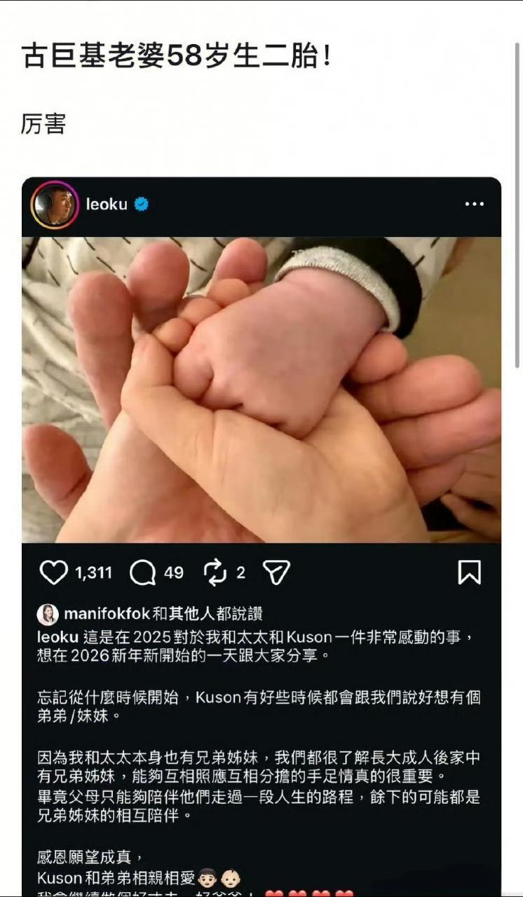 古巨基57岁的老婆生二胎?57岁不是绝经了吗怎么还可以生孩子呀!没想到古巨基