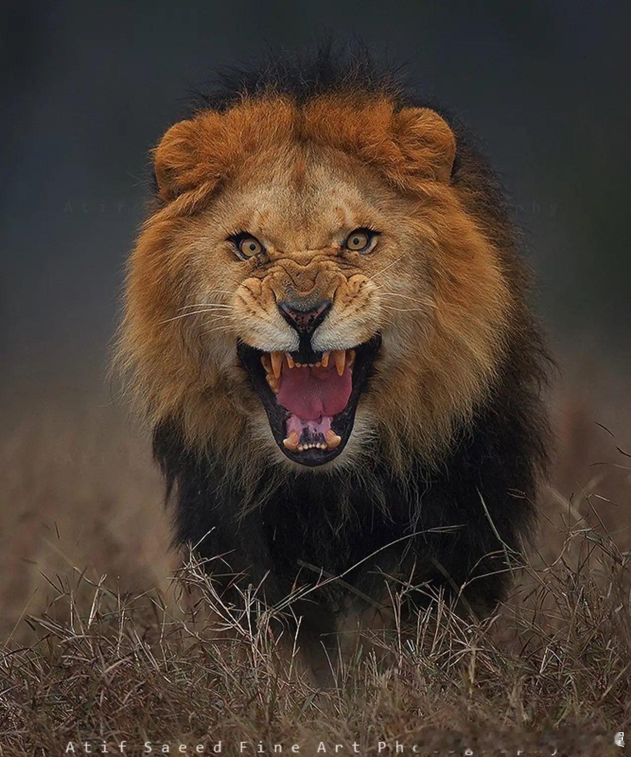 这张被称为《幽灵与黑暗》(The Ghost and the Darkness)的照片是野生动物摄影史上最著名的“生死瞬间”之一。 该照片由巴基斯坦摄影师阿提夫·赛义德(Atif Saeed)于 2012年 在拉合尔野生动物园拍下。赛义德当时为了拍出雄狮的“性格与地位”,冒险走下吉普车,并坐在车门附近的地面上使用500mm远摄镜头 进行拍摄。相机快门和镜头的运转声引起了雄狮的注意,它瞬间从平静状态切换为捕猎模式并向赛义德发起冲锋。在狮子距离他仅约3米 时,赛义德设法迅速跳回了一直敞开的车门内并迅速关门,才得以幸免于难。赛义德事后表示,虽然当时还能笑得出来,但回想起来极为后怕,并坚称这种拿命换照片的行为“绝不会再做第二次”。 这张照片在2015年于社交媒体上疯传,并在2026年依然被视为展现荒野捕食者致命张力的经典之作。