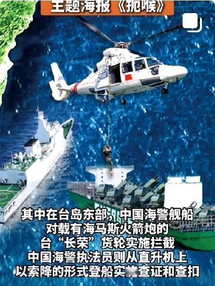 台海军演期间我海警动真格了! 前几天是美方先扣下我油轮的! 现在我方直接查扣了运军火的船! 海报上"敢运海马斯就登船"这七个大字特别扎眼。台海这边又起风浪,这次较量是真要动真格的了! 东部战区围台演习正紧锣密鼓地进行,海警船也紧跟着展开"扼喉"行动。直升机就在长荣旗下的货轮上空盘旋,把登船检查的画面做成了一张醒目的警示海报——想偷偷运海马斯?门儿都没有!这手操作简直是以牙还牙,让美方尝尝被自己扔出去的回旋镖砸到的感觉。 以前咱们都是口头警告了事,现在直接搞起了检查机制。不光海上要严查,空中也跟着严加管控。要是对方敢拦着,东部战区随时就能支援。没了美制武器输血,某些人还能折腾几天?网友打趣说:这波操作够刚,必须开瓶茅台庆祝一下! 下一场较量,会怎么打?咱们接着看!