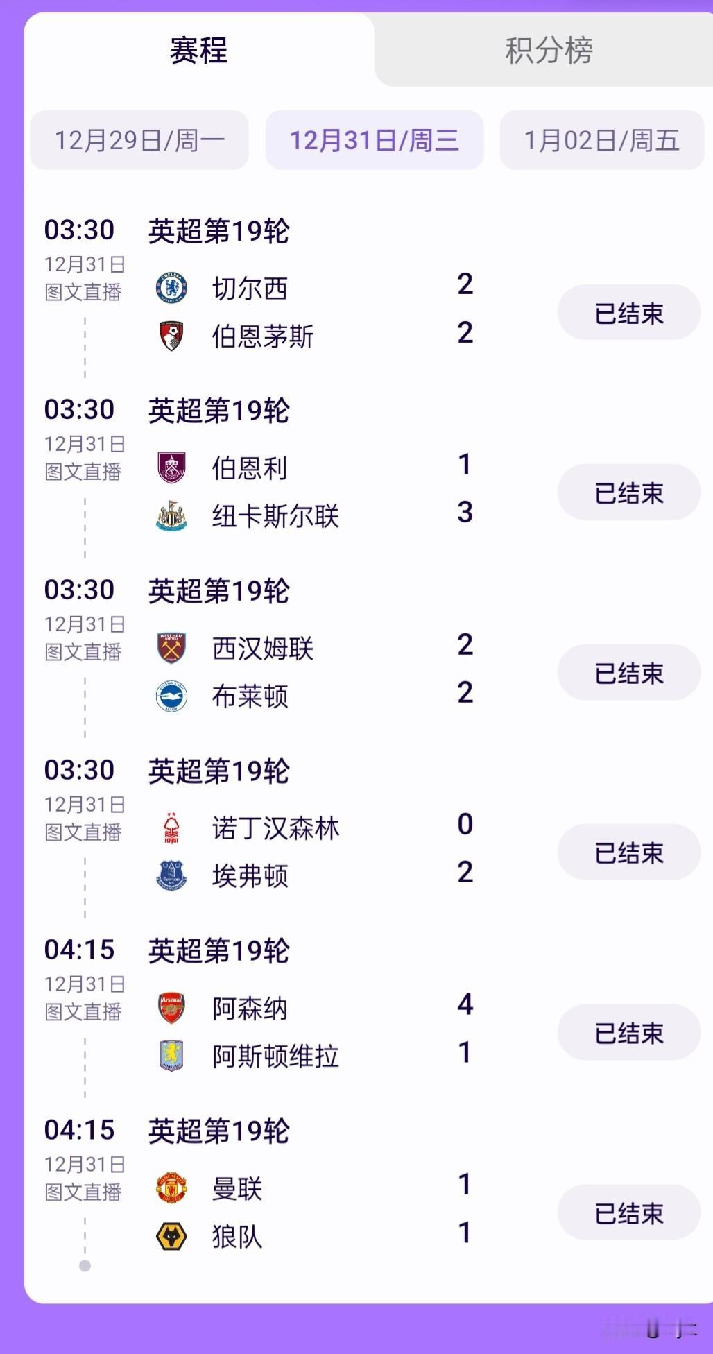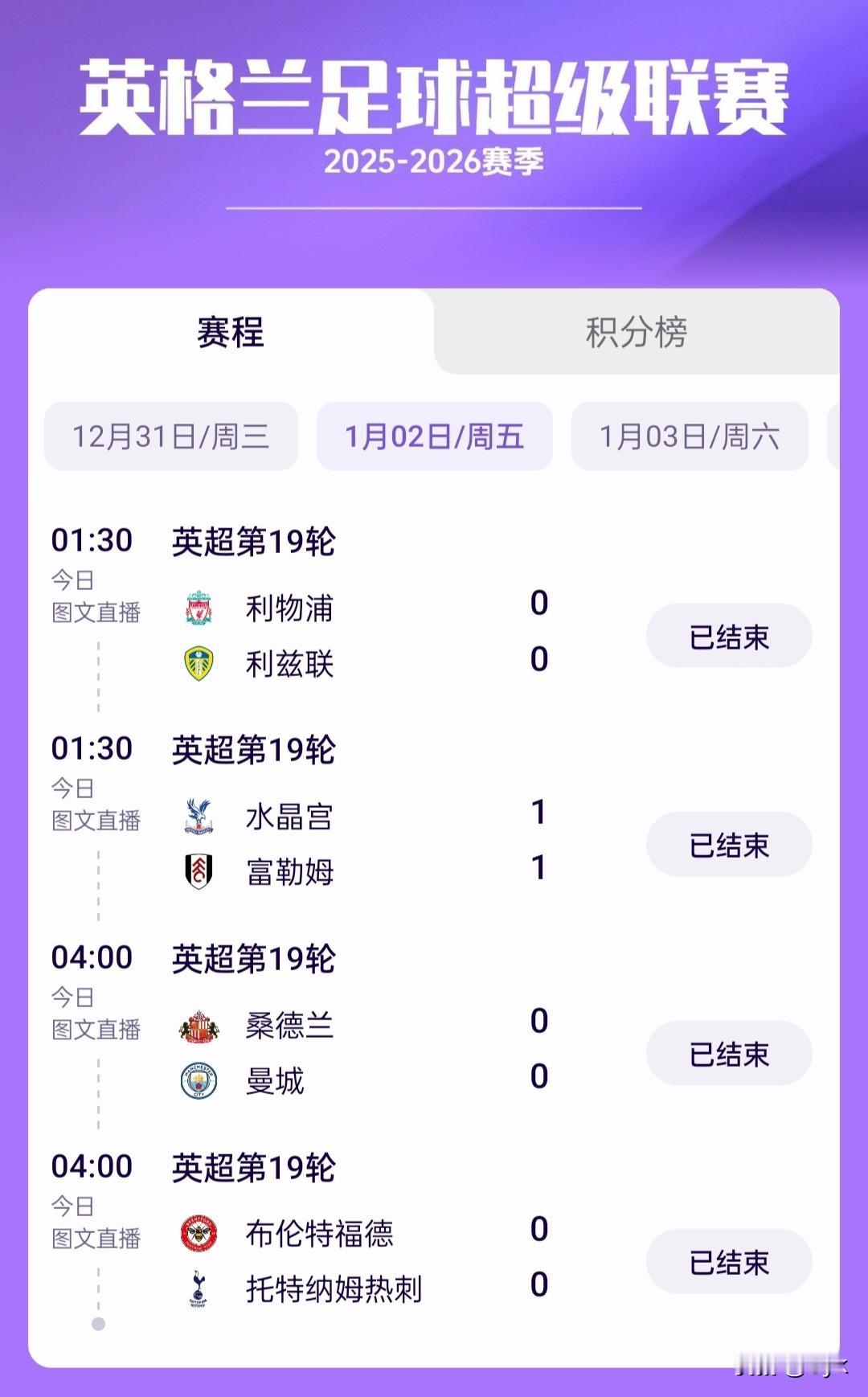英超第19轮上演平局盛宴,枪手成独苗。 英超第19轮的较量堪称“平局剧本专场”,本轮赛事里竟爆出7场平局,一众强队集体陷入不胜怪圈,唯有阿森纳成为为数不多的赢家。 本轮比赛中,纽卡斯尔联拿下胜利外,其余场次满是胶着:切尔西2-2战平伯恩茅斯,西汉姆联与布莱顿同样握手言和;曼联1-1被狼队逼平,利物浦0-0闷平利兹联,曼城更是0-0战平桑德兰,热刺也和布伦特福德互交白卷,水晶宫与富勒姆的对决也以1-1收尾,诺丁汉森林0-2不敌埃弗顿是为数不多的分出胜负的场次之一。 所谓的英超Big6里,除了阿森纳4-1大胜阿斯顿维拉保持胜势,曼联、利物浦、曼城、切尔西、热刺全部未能取胜,形成“2-10集体不胜”的奇特局面,这样的赛果也让积分榜的争夺更具悬念。